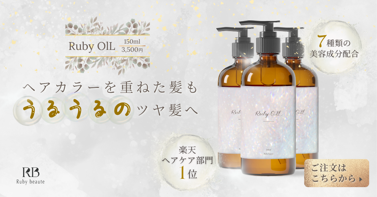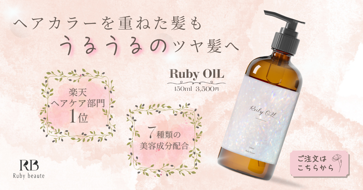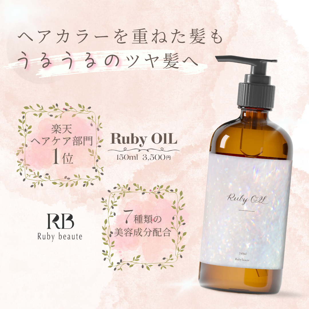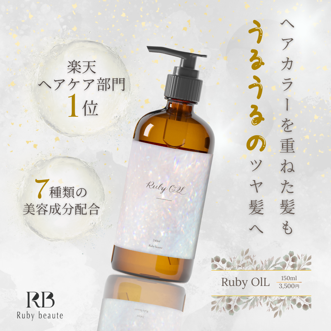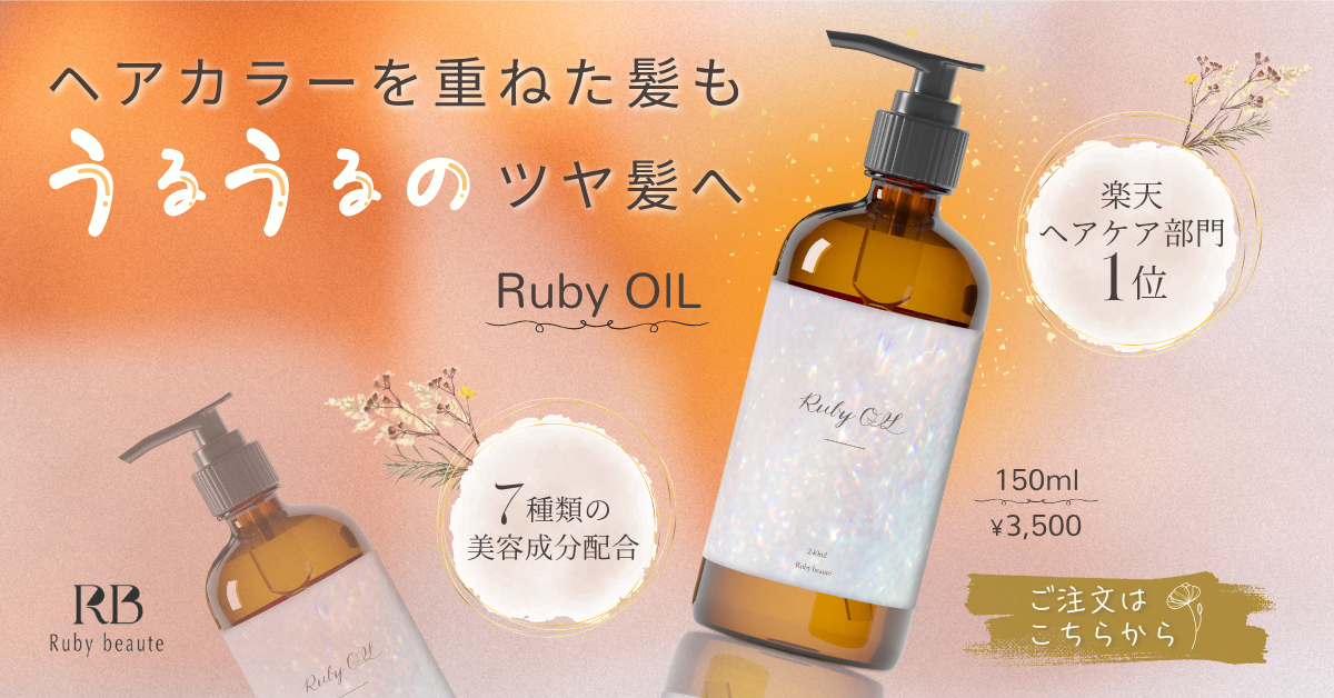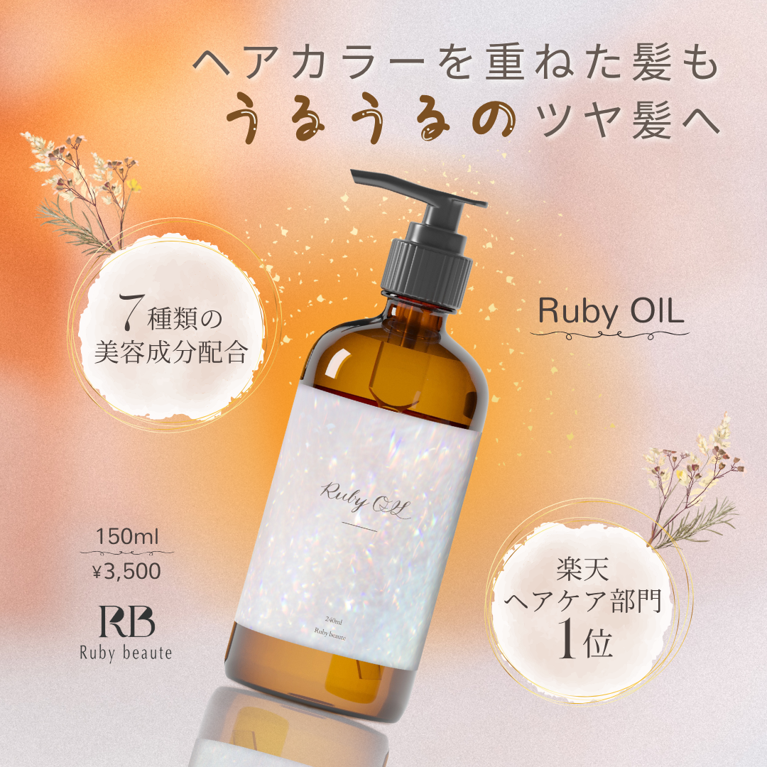 ・商品名「Ruby OIL」はヘアカラーを楽しむ方のお悩みに寄り添ったヘアオイルとして開発されました。ヘアカラーで傷んだ髪のパサつきを、潤いのある滑らかなツヤ髪へ導きます。保湿美容成分を7種類配合しており、傷みのケアはもちろん、 カラーの色持ちも良くしてくれます。普段の生活やリラックスタイムにも気にならない無香料。