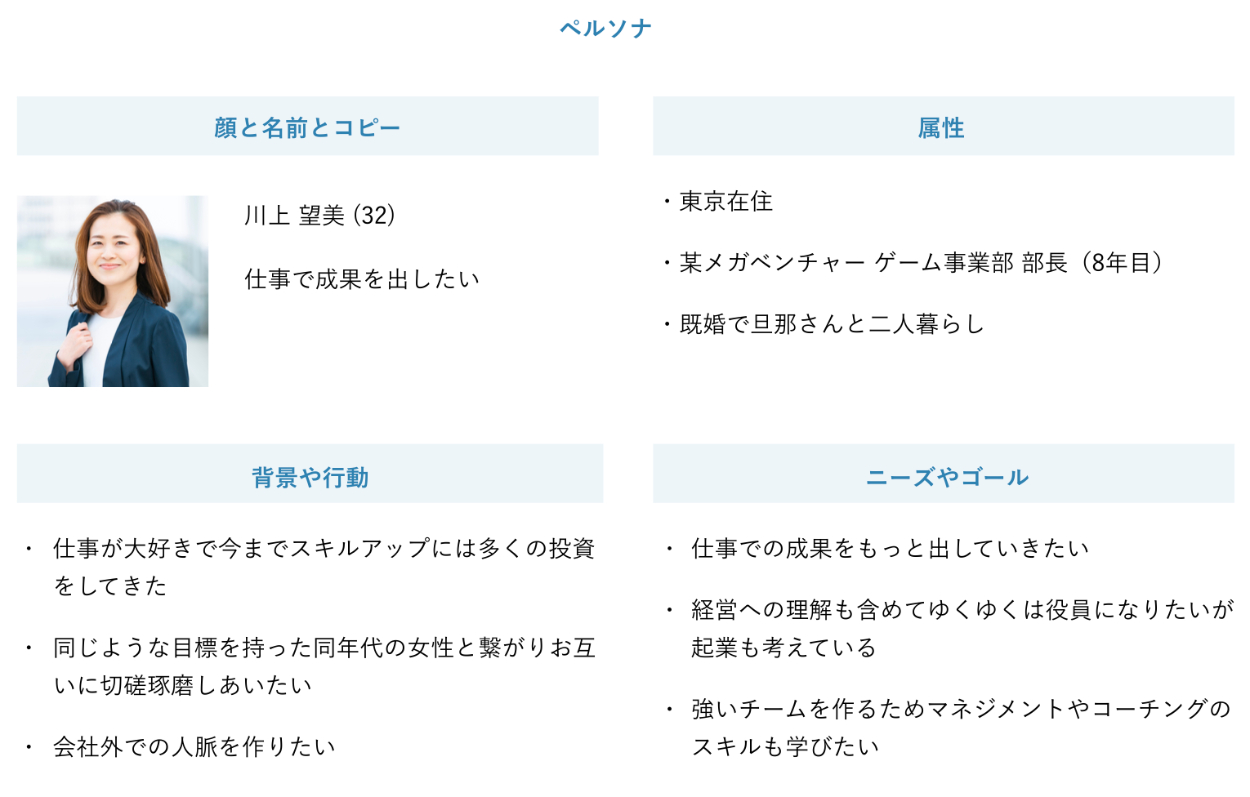 女性向けのビジネススクールを展開している。会員は20~30代の女性が多く、キャリアアップのためにビ ジネススキルを学び、さらにそのアウトプットの場として定期的にビジネスコンテストなどのイベントも 開催されている。