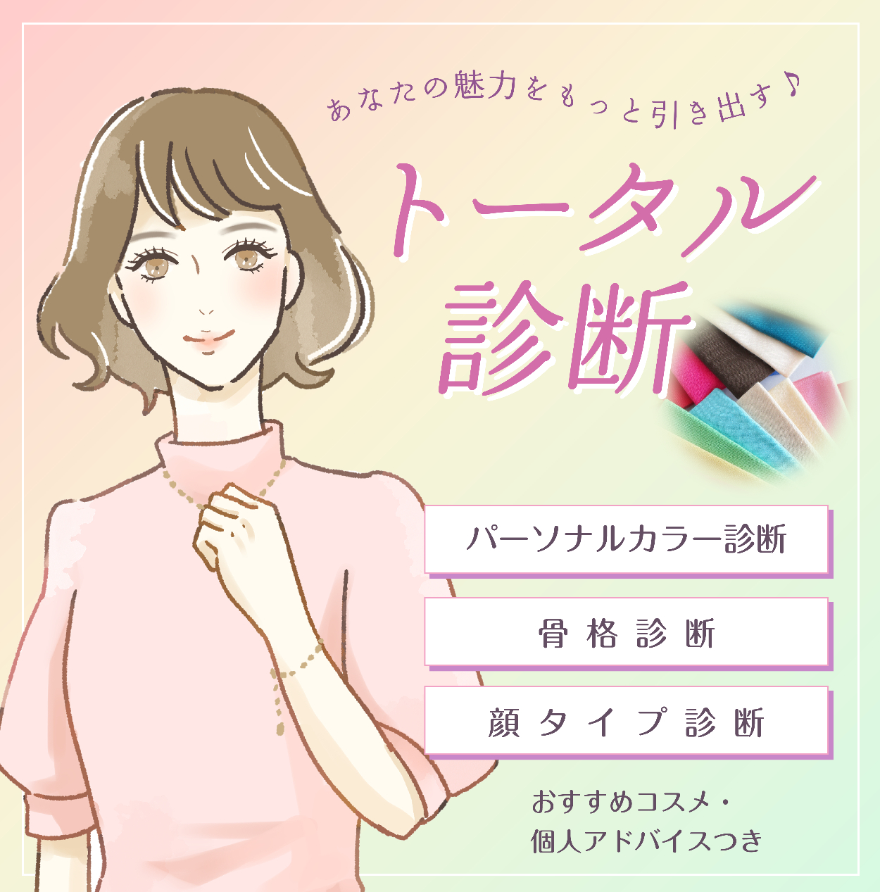 ココナラ用 トータル診断のメニュー画像 かがみ まゆこ デザイナー/イラストレーター 自主制作です。自作のイラストを使用し、ココナラで使用できるようなパーソナルカラー診断、骨格診断、顔タイプ診断のメニュー表を制作しました。