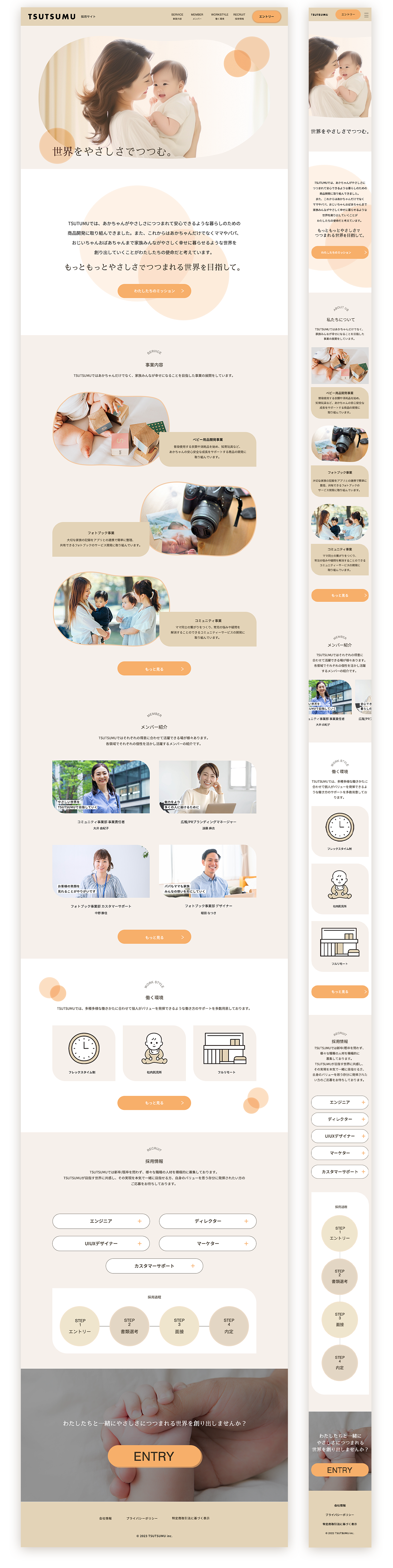 TSUTSUMU株式会社の「世界をやさしさでつつむ」というコンセプトと採用サイトらしいスタイリッシュな印象の2つを意識。
