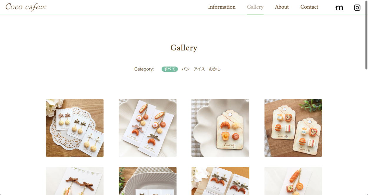 過去売り切れた作品の写真も展示できるようギャラリーページを設けました。「パン」や「アイス」など、ジャンル別にソート可能に。