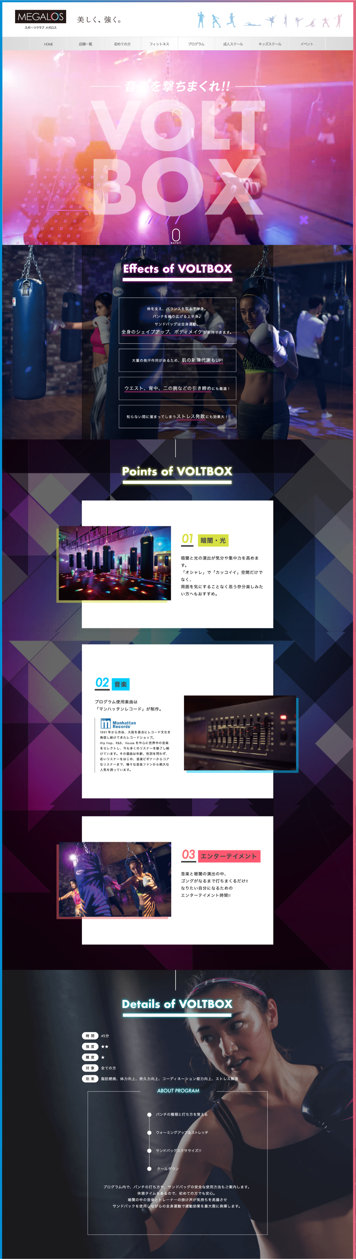 フィットボクシングジャパンとメガロスとの共同開発プログラムVOLTBOXの紹介ページ。体だけではなく、耳でも体感する、ワンランク上の新しいエンターテイメントフィットネスを提供している。