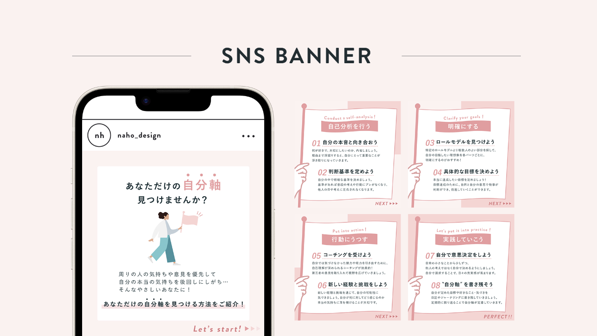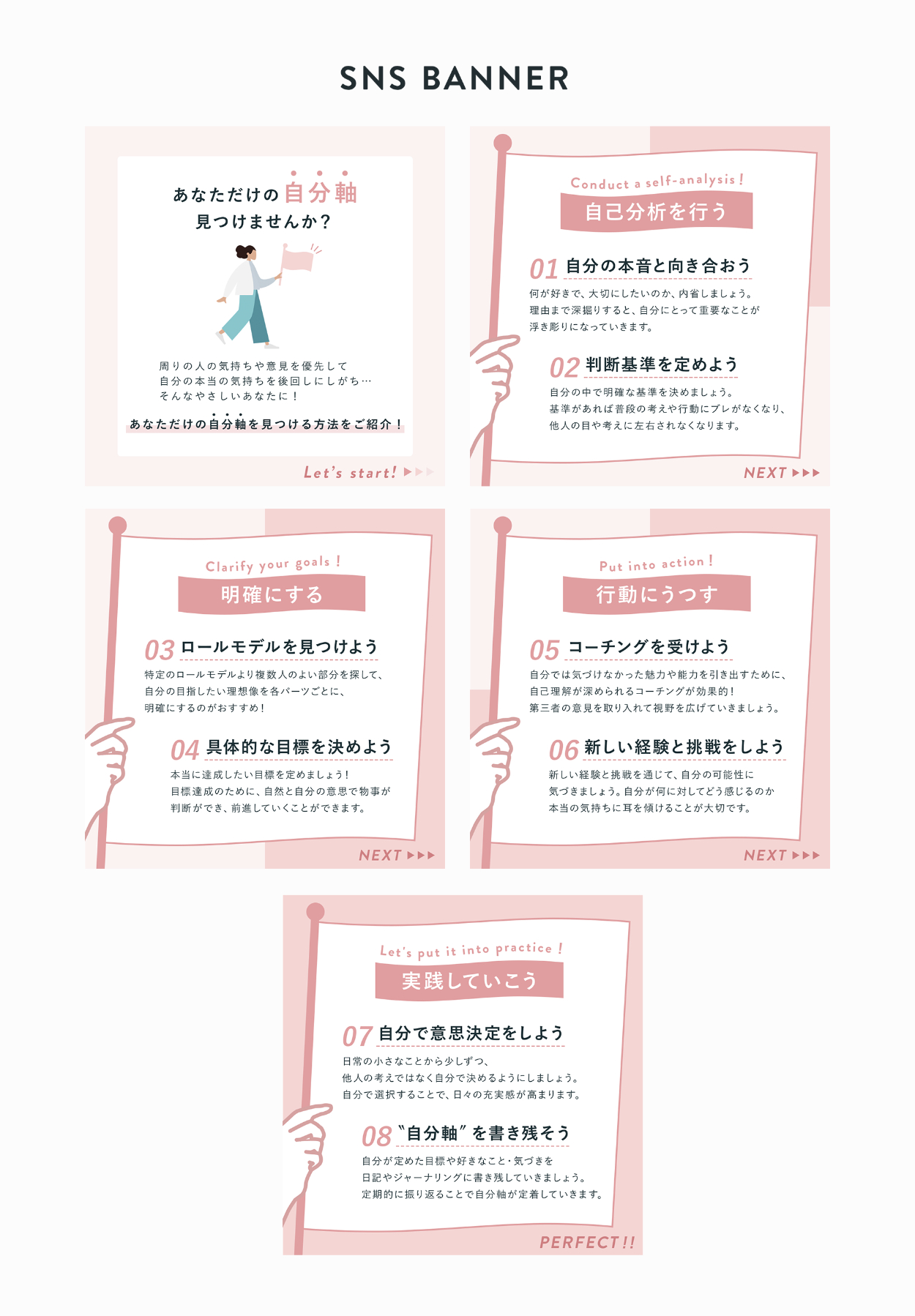 SHE株式会社様の公式Instagramアカウント投稿用の画像を制作しました。 テーマ:「自分軸を持つために必要なこと8選」