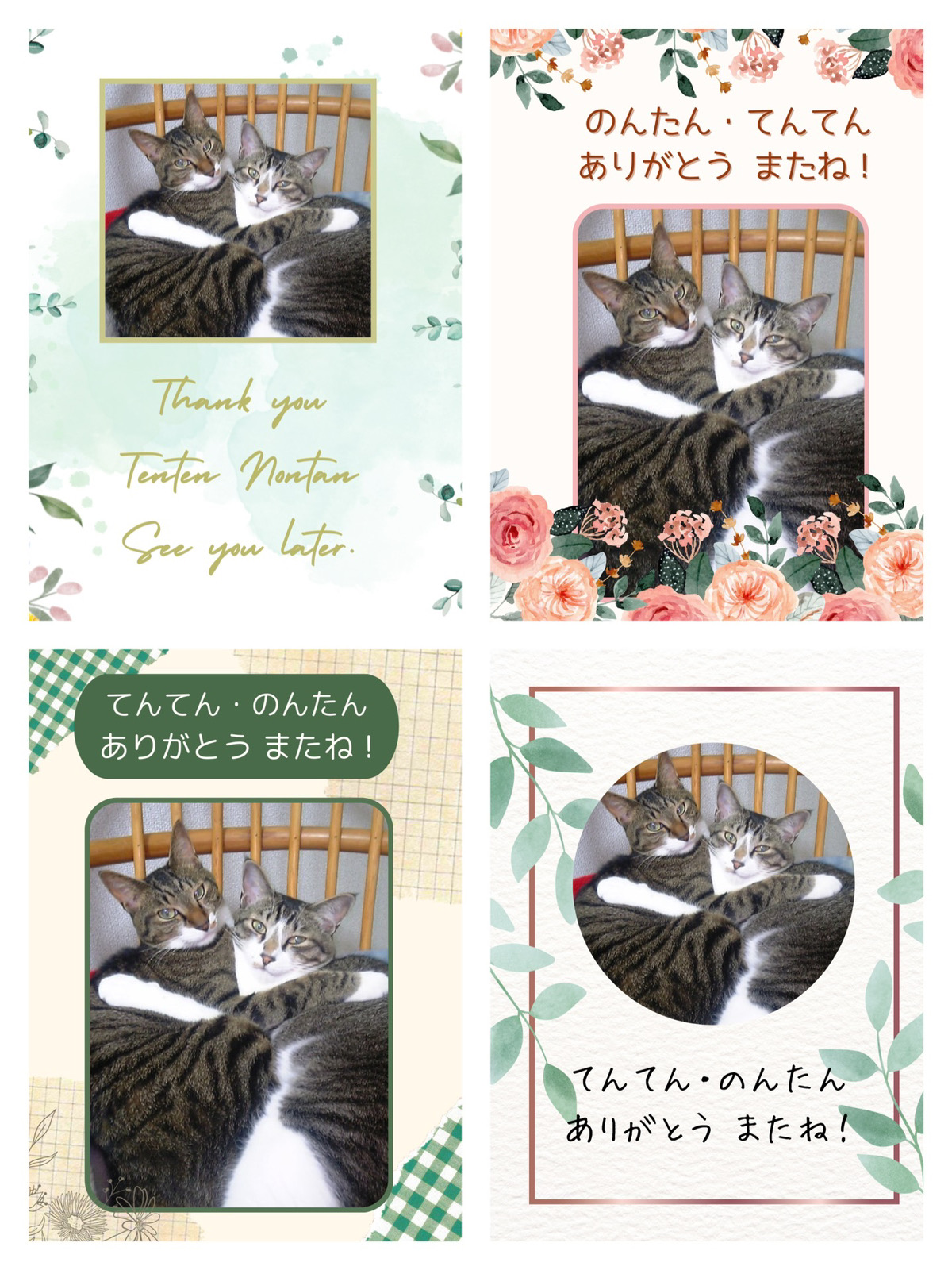 ★友達のネコちゃん てんてん(左22歳)が先日亡くなり、記念に写真プリントしたいからとお願いされました。のんたんも19歳でと言うことでとっても長生きさんなネコちゃん達、美形です。全4種類。テンプレートはめっちゃカスタマイズしています。