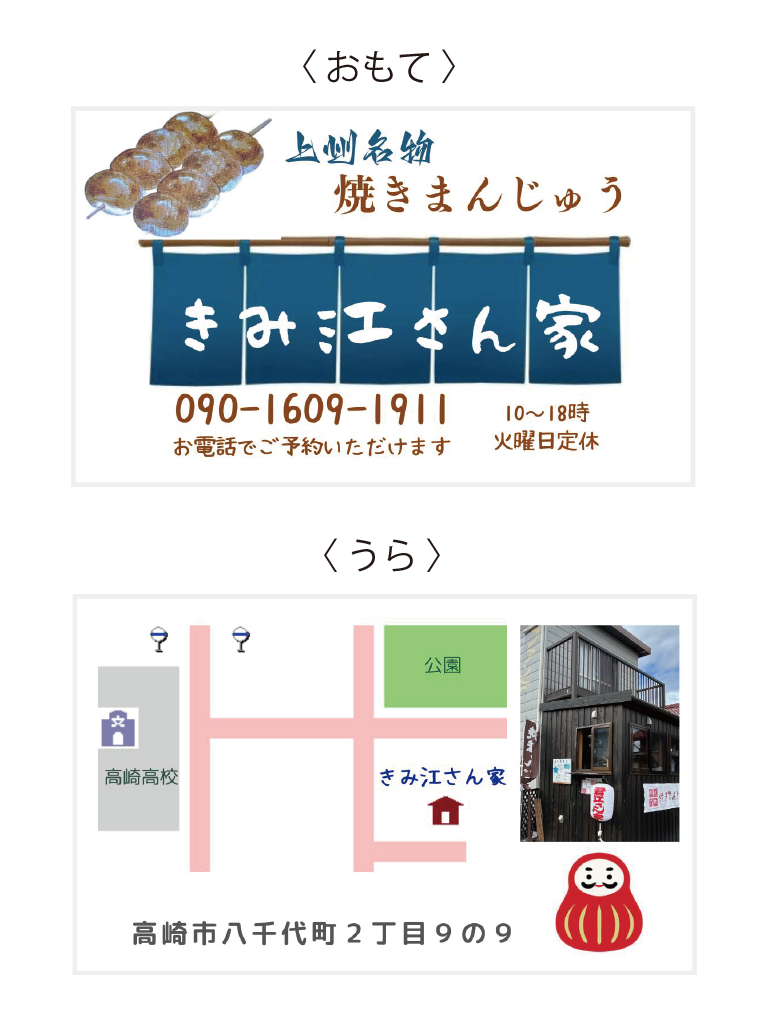 ★群馬県高崎市の高崎高校 (通称・たかたか)の近くにある群馬名物の焼きまんじゅう屋さん「きみ江さん家」です。〈ケンミンショー〉にも出演したお店です!カードとメニューを作らせて頂きました。メニューは「メニュー」にあります。《完全オリジナルデザイン》