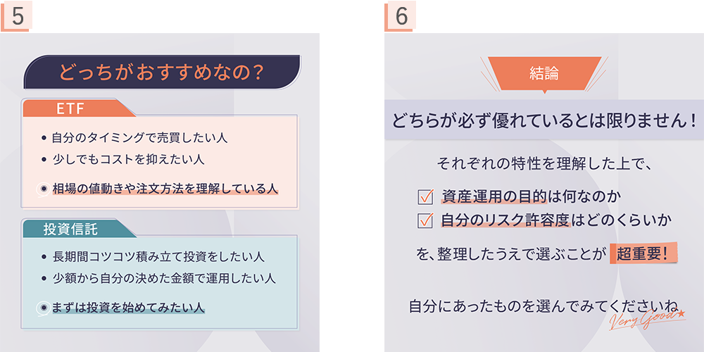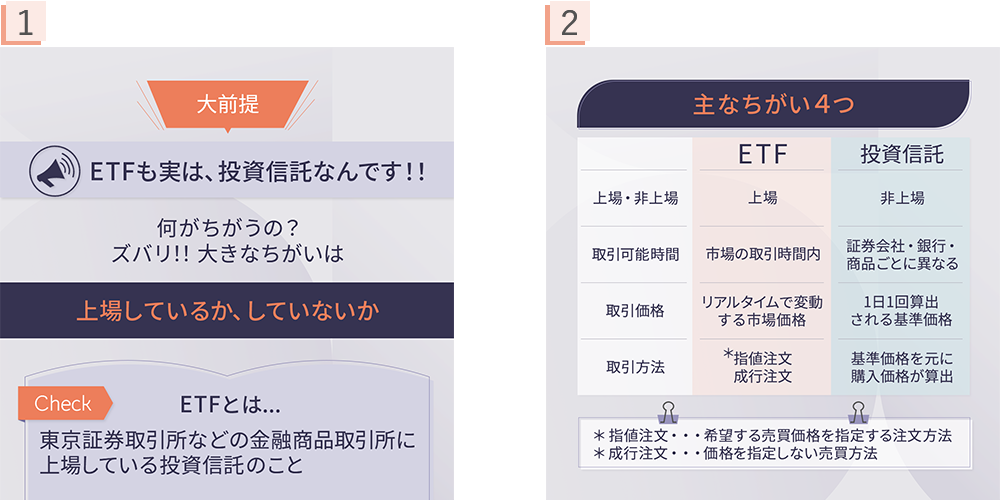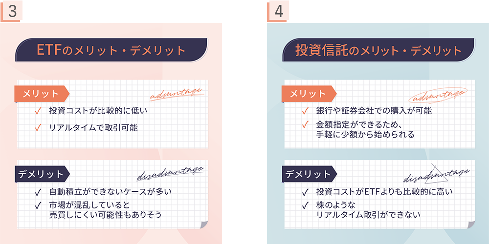 「初心者向け解説」というタイトルなので、投資初心者の方にも分かりやすいと感じてもらえるよう、内容によって背景や文字色を変えて視覚的にも情報が読みやすくなるよう工夫しました。(ETFはオレンジ、投資信託はグリーン)