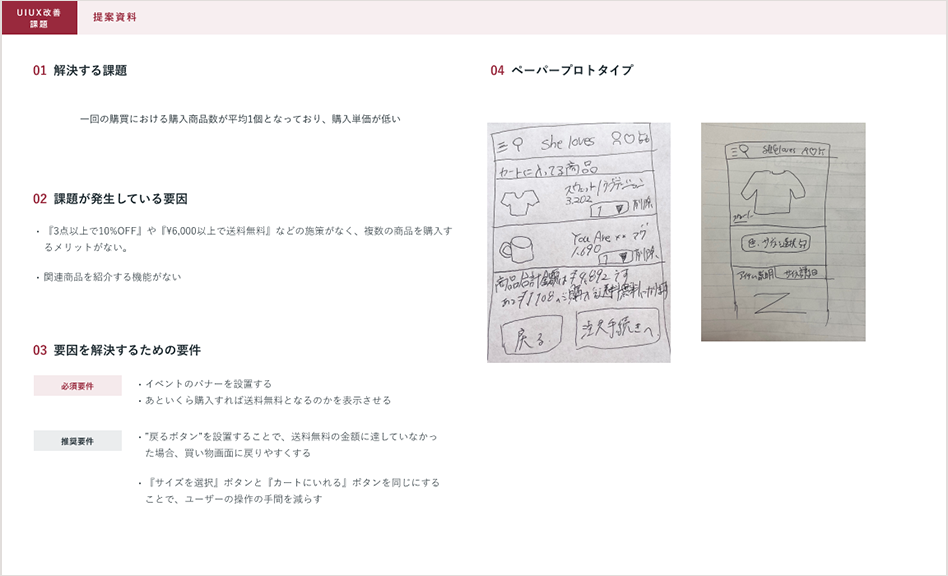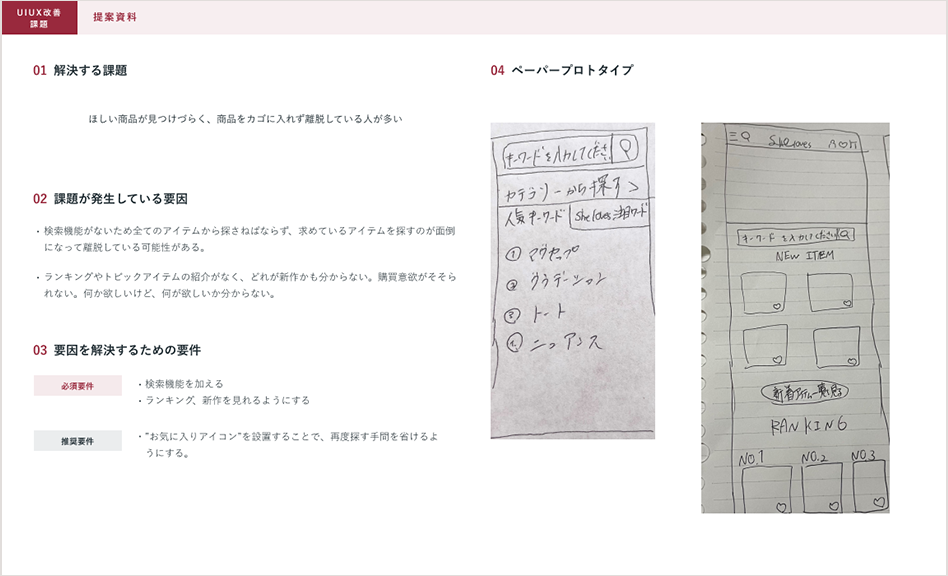 最初の要件で提示された課題に対して、その課題が発生する要因から仮説立て、それぞれに対する解決策を提示した資料を作成。