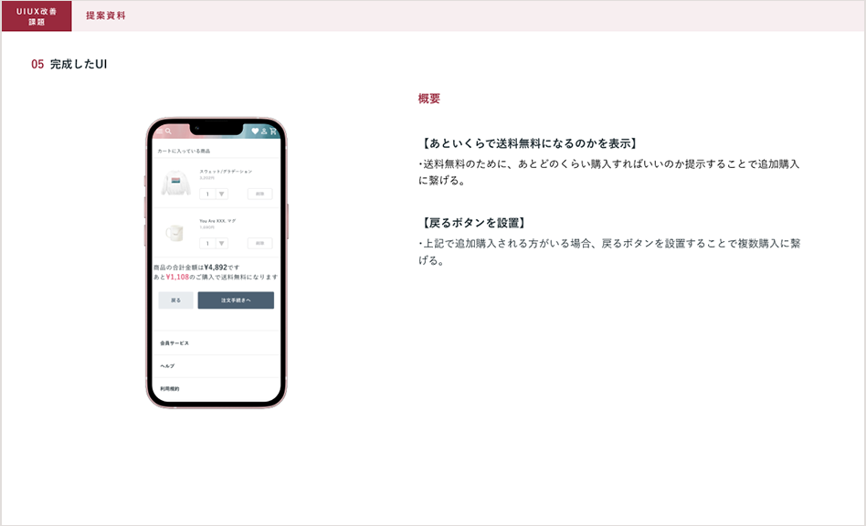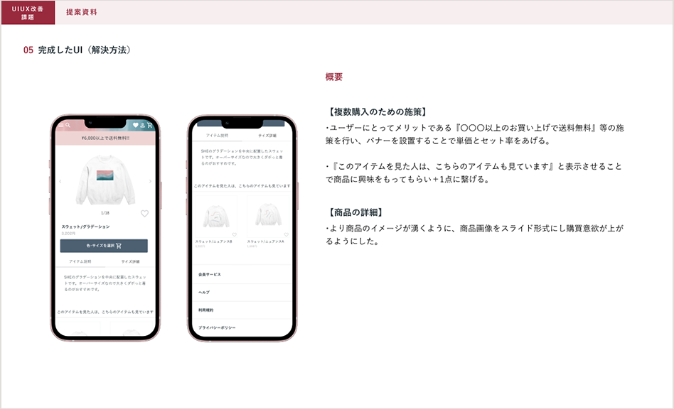 デザイン基本原則を遵守し、項目を分けたり、太字や文字のサイズに差をつけたりしました。画像を掲載することで、仮設に対してクライアントが理解しやすい資料作成をしました。