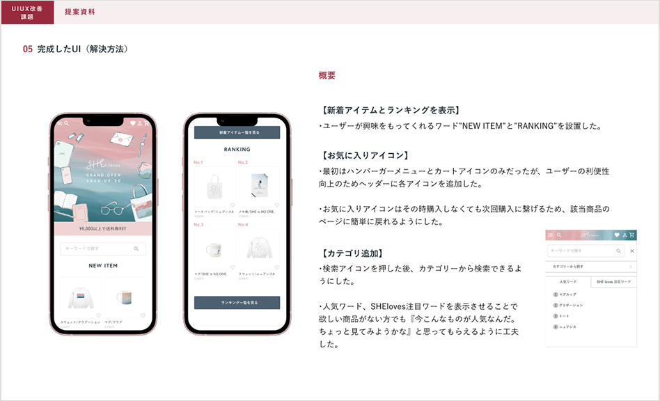 デザインだけでなく、情報過多になりすぎないように優先順位を意識、SHElovesの世界観を崩さないようにしました。