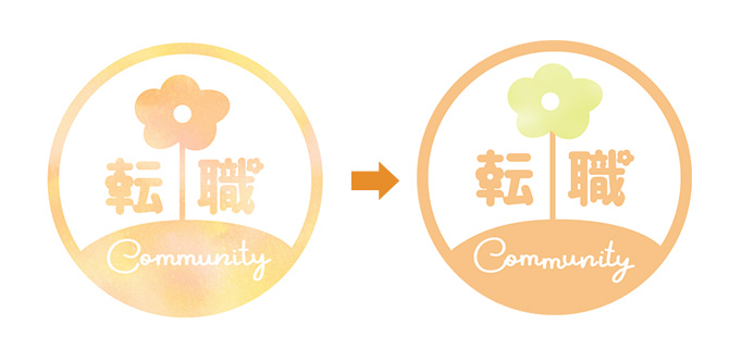 - 「転」「職」それぞれの漢字の一部を花のモチーフにし、画数の多い固いイメージの漢字に柔らかさが出るようにしました。