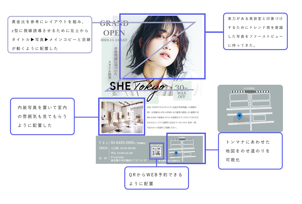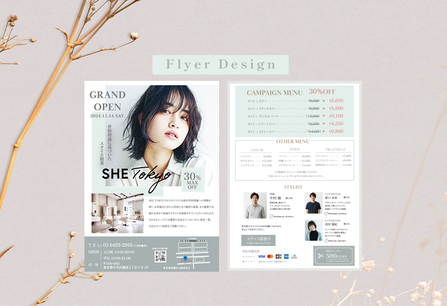 OVERVIEW SHElikes MULTI CREATOR COURSE の課題にて、美容室のグランドオープンの告知のフライヤーデザインを制作しました。 (テキスト指定あり、情報設計からデザインまで) 制作期間:約2週間