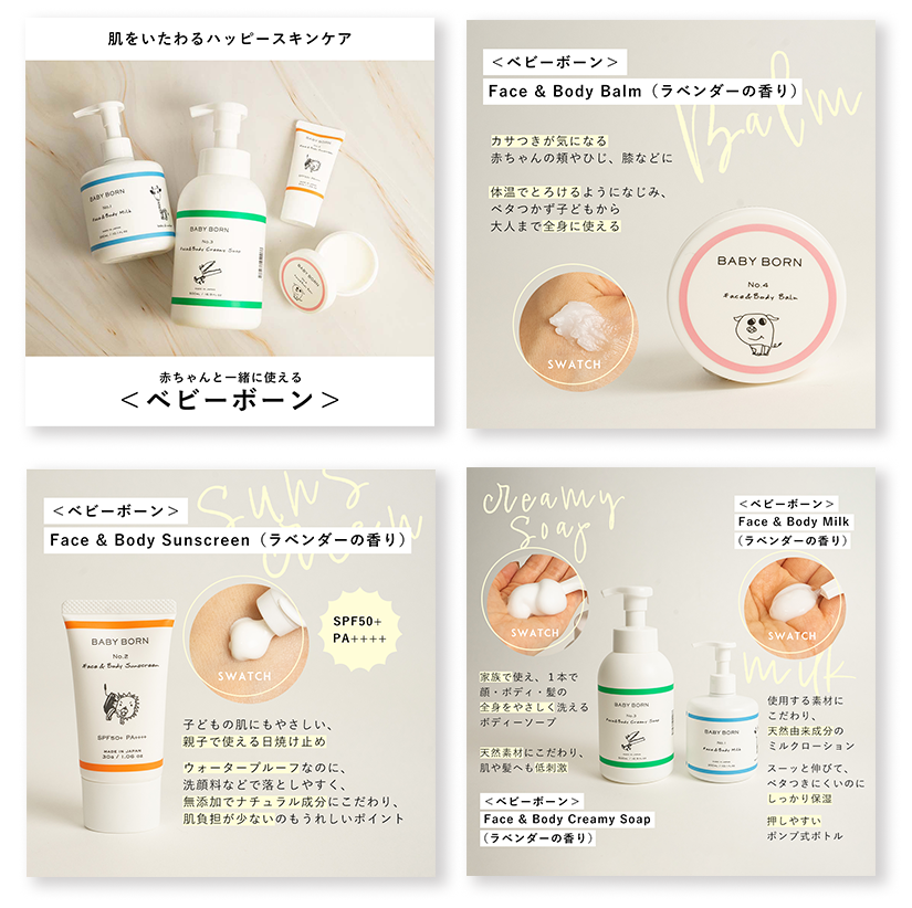 meeco様のシンプルな世界観の中とベビーボーン様の「無添加」「天然素材」「親子で使える」などの優しいの世界観のどちらも壊さないように配色や装飾を意識しました。