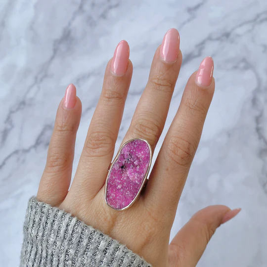 Explore the enchanting beauty of the Sagacia Statement Cobalt Calcite Ring . The specialty of these exquisite rings is that they are diligently handcrafted in pure 925 sterling silver and they feature 100% genuine and authentic cobalt calcite gemstone. The cobalt calcite gemstone is well-known within the spiritual community for the healing it brings to the heart chakra and its ability to inspire unconditional love and compassion. The captivating pink tones of cobalt calcite make these rings a great addition to any jewelry collection. These one-of-a-kind rings are perfect when you wish to make a bold statement, and not only will these rings draw attention, but they will also add a touch of warmth to the outfit you wear. So, purchase Sagacia's Statement Cobalt Calcite ring and let it remind you of the love and kindness that is all around out in inconceivable forms.