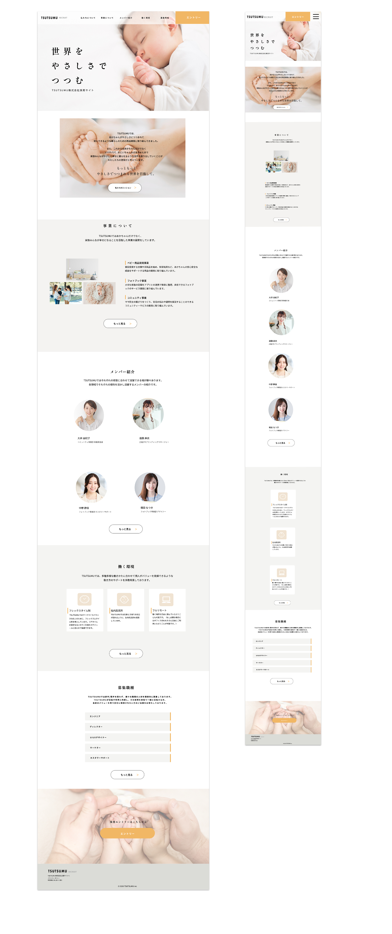 会社内容(理念・事業内容)→働く環境(社員・制度)→採用情報(募集職種・応募フロー)