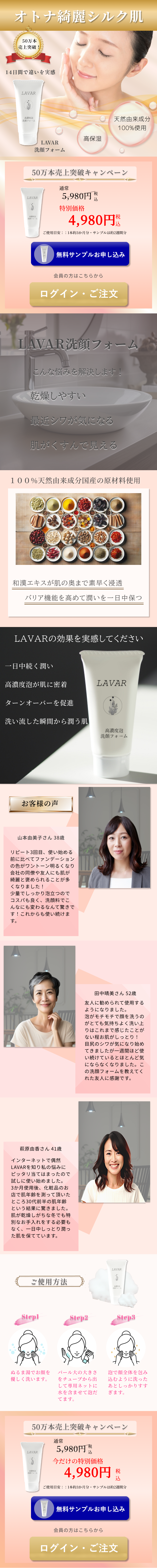 LAVAR洗顔フォームLP itsuki.spazio フリーランスWebデザイナー OVERVIEW LAVAR洗顔フォームのランディングページです。 ターゲット層は30代後半から50代前半の女性で上品で高級感のあるイメージのデザイン 色はピンクとゴールドをベースに使用、全体的に光沢感を意識しました。