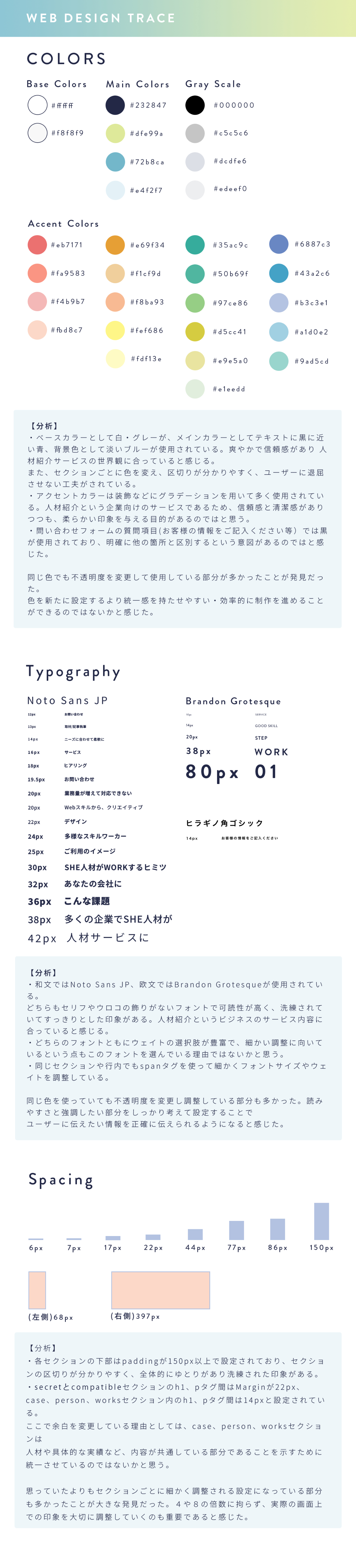 トレースをしながらPCとスマホの表示の違いを分析し、Google Chromeの検証ツールを用いてフォントの種類やサイズ、余白を調べスタイルガイドとしてまとめました。