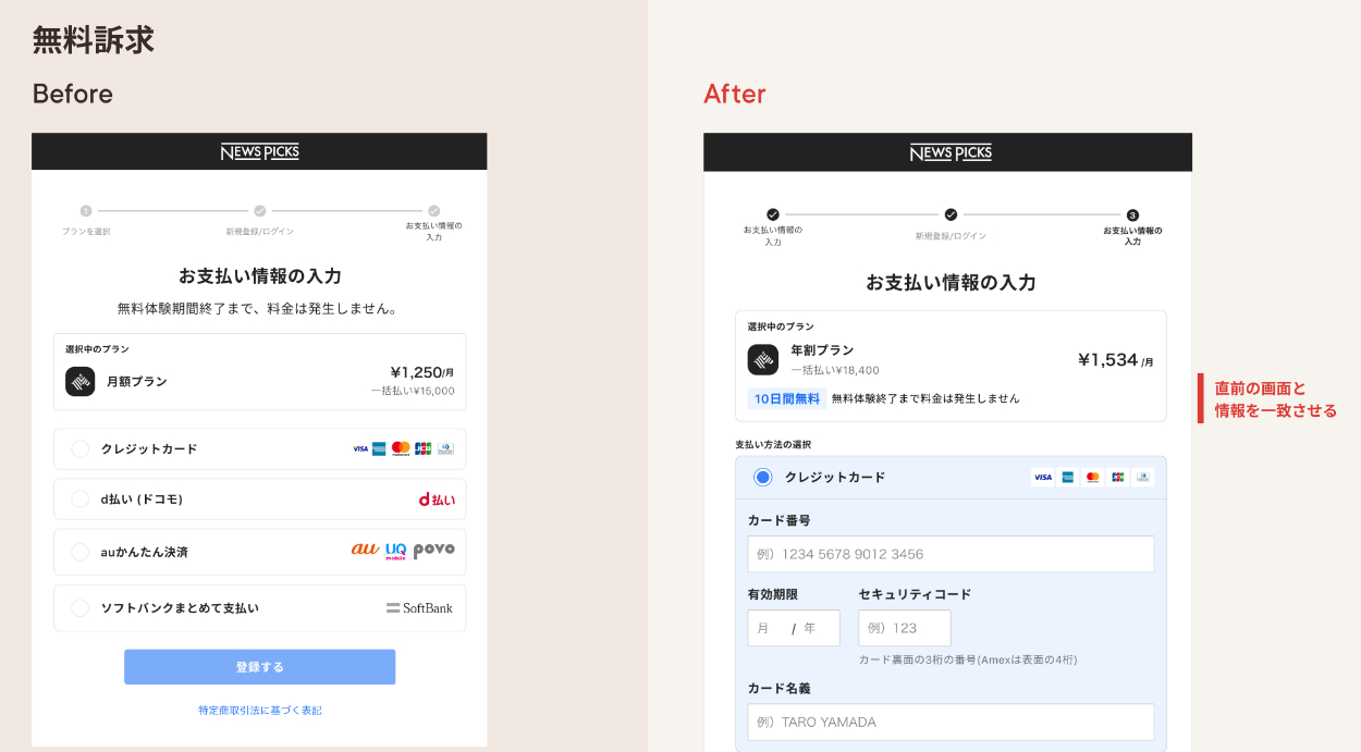 ③ひとつ前の画面で訴求されいてる「無料」を決済情報入力画面でも表示