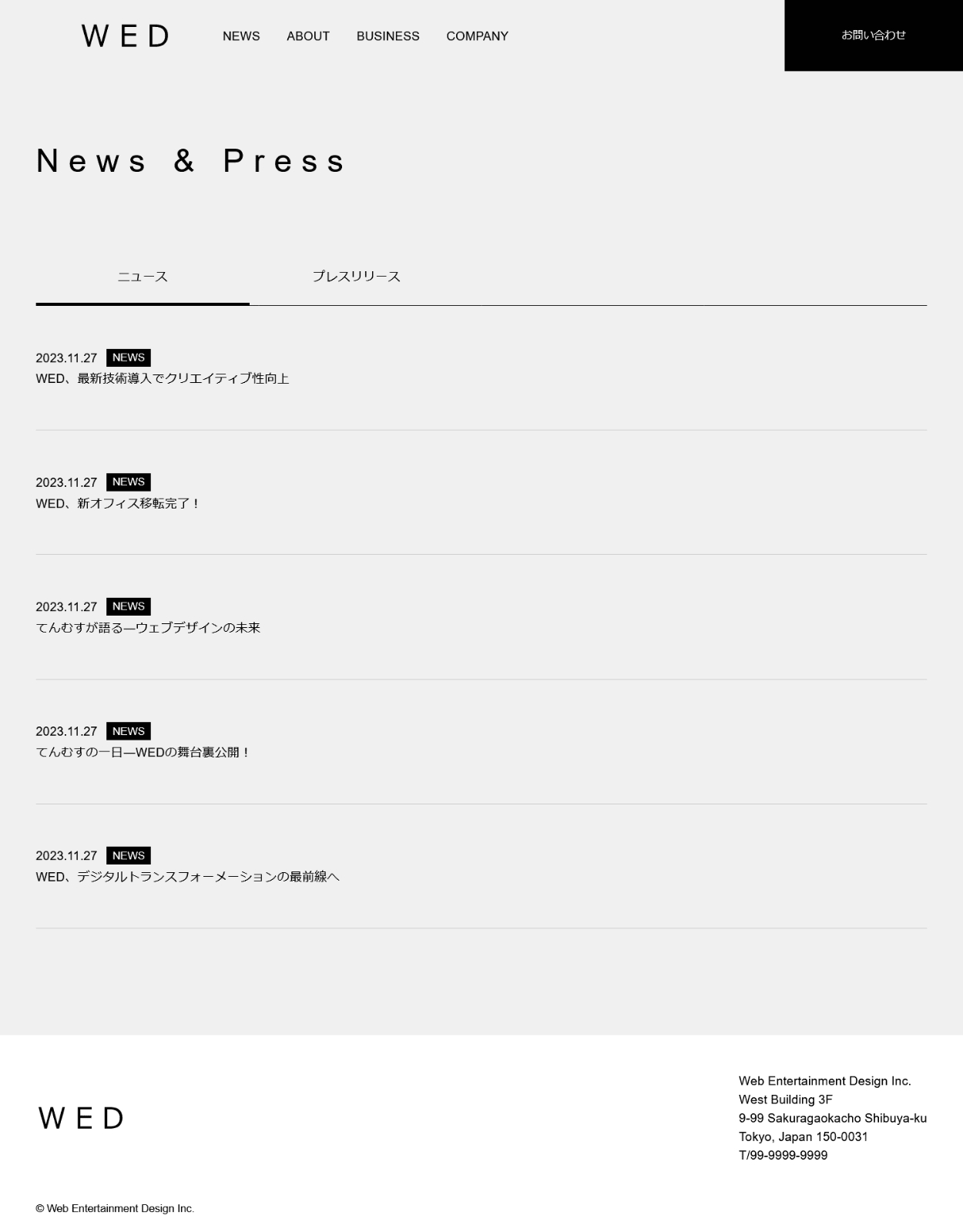 ・記事一覧ページ(archive.php)は2つのカテゴリーが表示できるようになっています。基本はカテゴリー「NEWS」の記事が5記事表示されます。「プレスリリース」タブをクリックするとカテゴリー「PRESS」の記事が5記事表示されます。プレスリリースの記事はサブクエリでループさせて表示しています。どちらも記事をクリックすると詳細ページに飛びます。