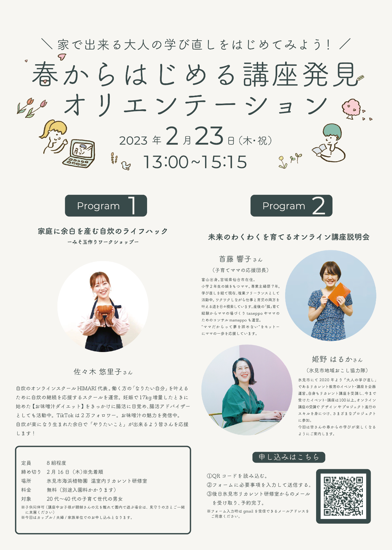 2023年2月23日(木・祝)に氷見市海浜植物園リカレント研修室にて行われた、『春からはじめる講座発見オリエンテーション』のA4フライヤー制作をしました。イラストから制作しました。