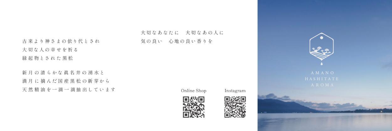 - AMANOHASHITATE AROMA様の過去制作物(ホームページ、リーフレットなど)の世界観を踏襲しつつ、さらに現在のターゲットに刺さるようにブラッシュアップした。