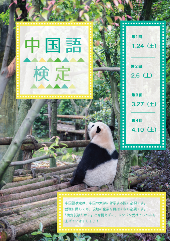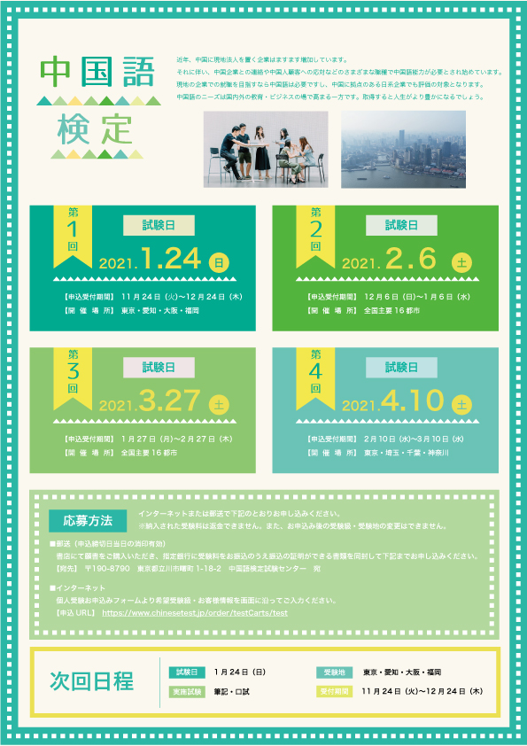 上段で中国語の重要性を説明し、中段に試験日程を記載しています。