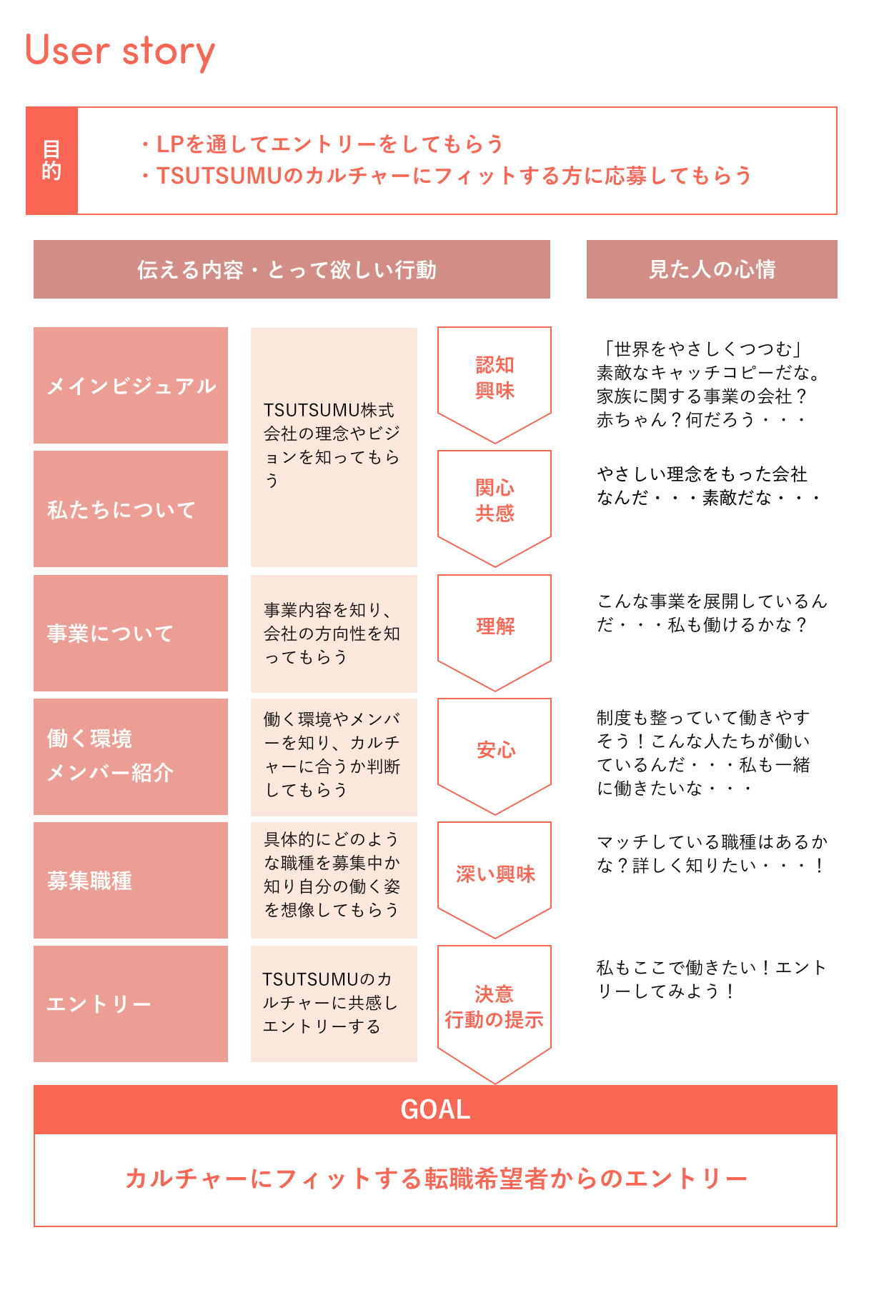 目的としている「LPを通してエントリーをしてもらう」「カルチャーフィットする方に応募してもらう」を達成するために、ユーザーにとってほしい行動とプロセスを組み立てました。