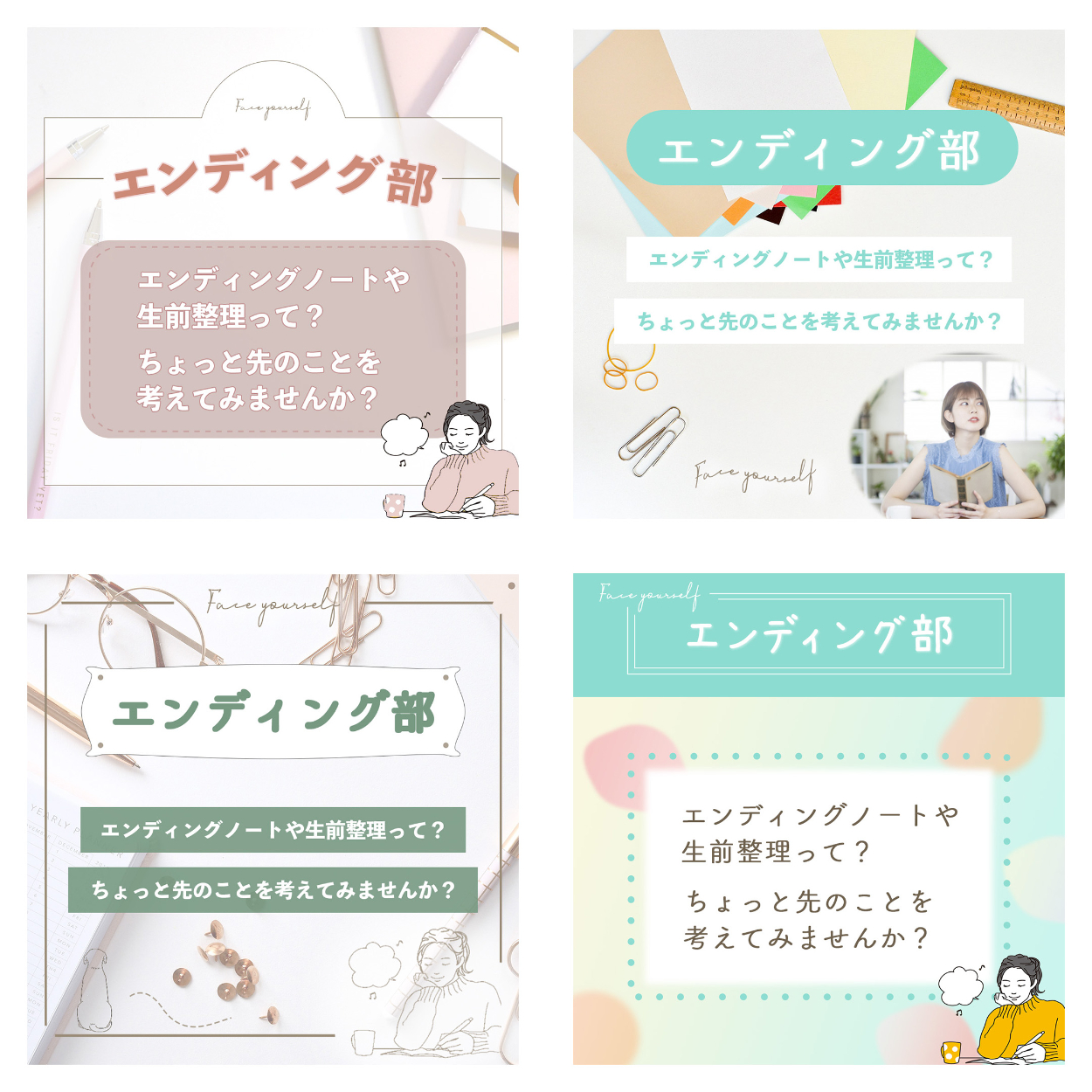金融についてを学ぶ女性のためのコミュニティ「きんゆう女子。」内で活動されている「エンディング部」さまよりご依頼をいただきました。エンディングノートや生前整理などについてをテーマに活動されています。ブログ記事のサムネイルやSNSバナーを作成させていただきました。