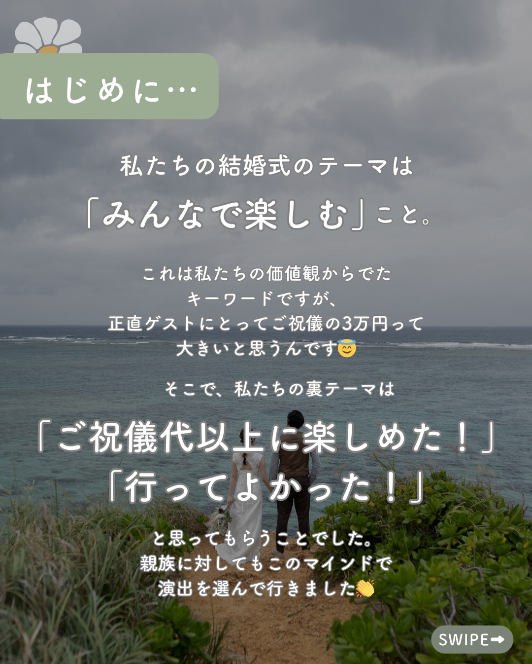 これから結婚式を挙げるプレ花向けに、Instagram投稿作成を行いました。リールで反応がよかった『やってよかった結婚式の演出』をテーマに企画立案からキャッチ・デザイン・キャプション・ハッシュタグ設定まで行いました。※自主制作※