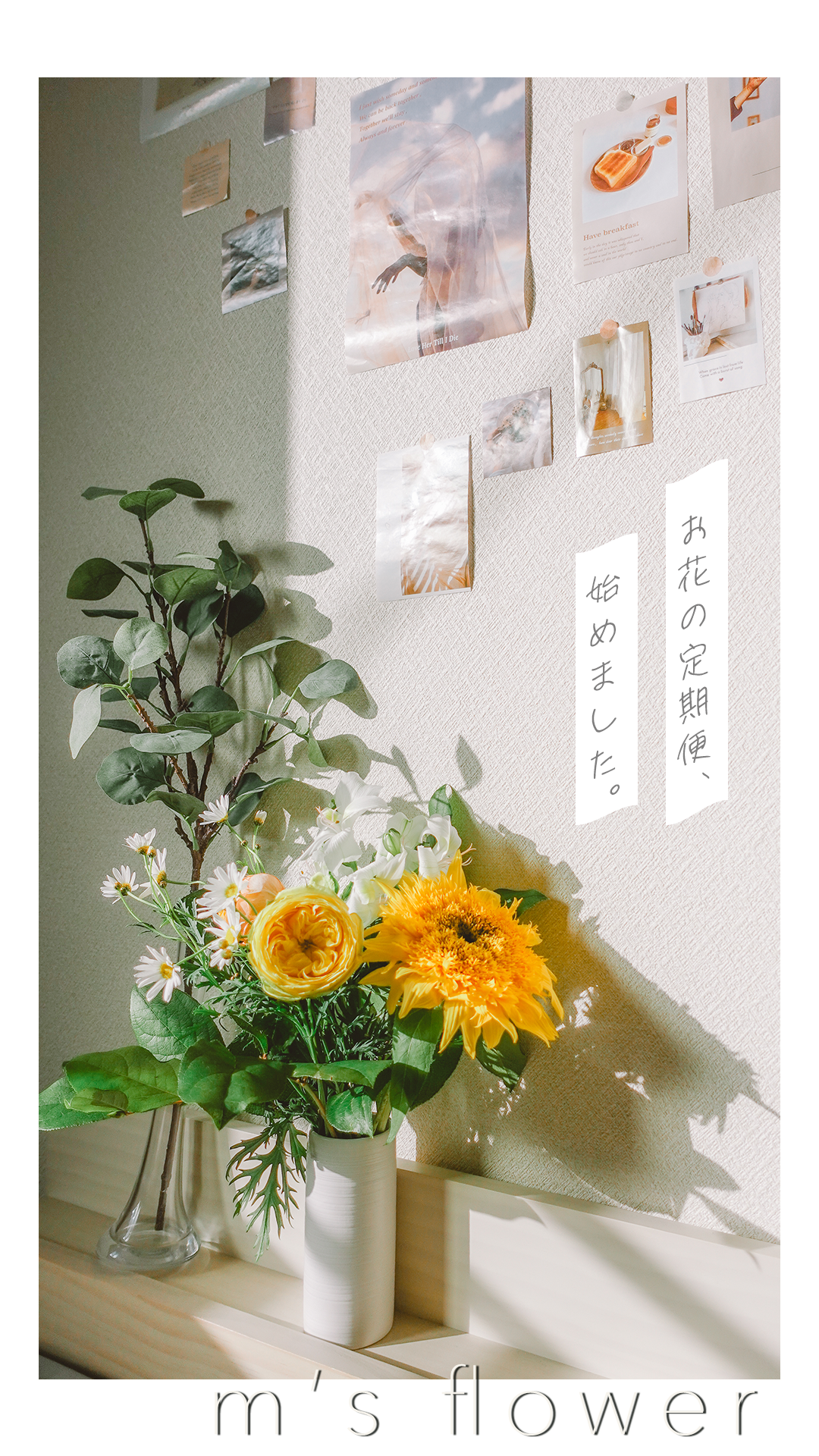 【自主制作】お花の定期便バナー ミイ webデザイナー/フォトグラファー/動画クリエイター OVERVIEW お花の定期便のブランディング用バナー広告です。 【ポイント】・お花の美しさが伝わるよう自然光の中撮影。・手書き文字を加えることで親しみやすさを演出。・ブランド名(仮)にドロップシャドウを付け、浮き出ているような立体感をつくりました。