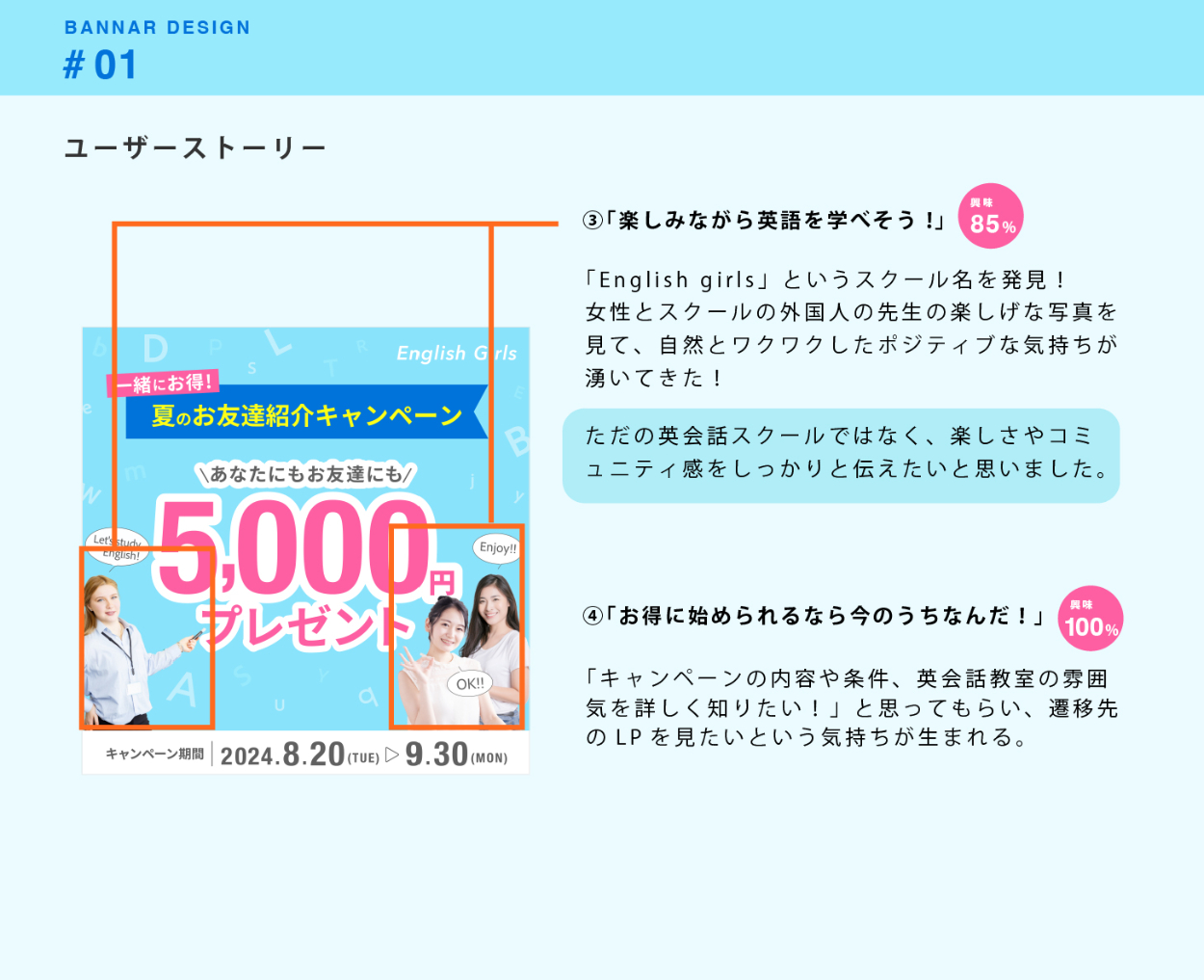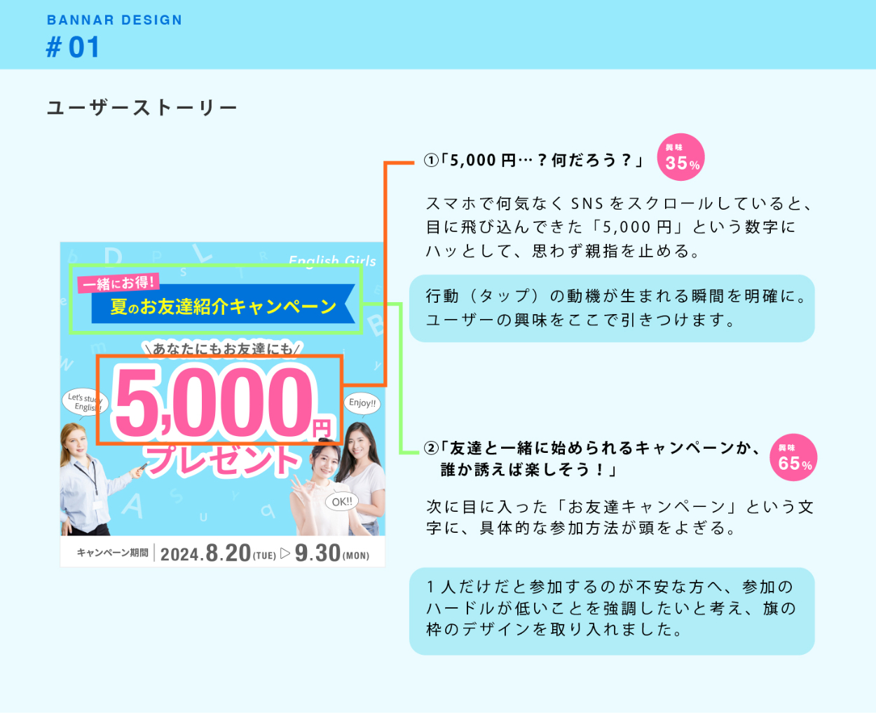 SHElikes MULTI CREATOR COURSE Designerにて、実際の案件を想定したバナー制作に取り組みました。特にユーザーストーリーを考え、情報設計やビジュアルデザインをするように意識しました。