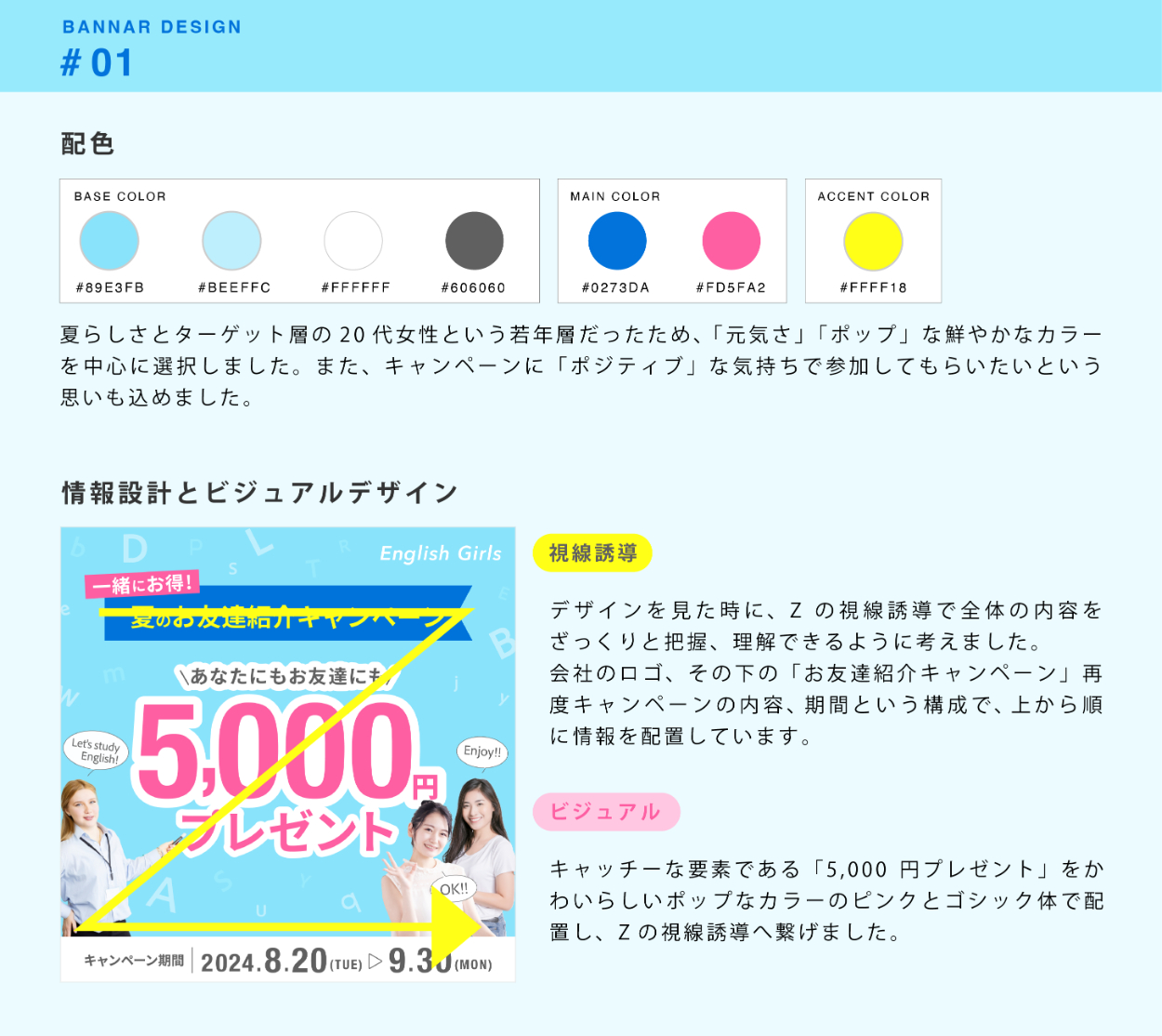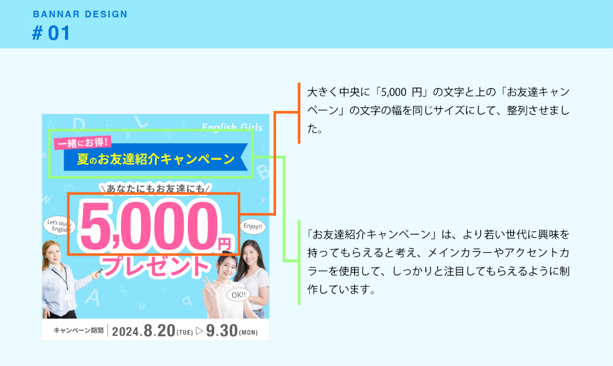 - 「Zの視線誘導」を活用したデザインは、視線が自然と左上から右上、そして左下に移動するため、情報の把握がスムーズです。よってこの法則を利用して、キャンペーンの理解をしてもらおうと考えました。