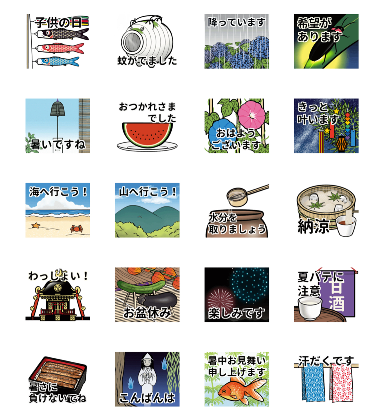 LINEスタンプ1 宇津木志加@イラストレーター イラストレーター OVERVIEW アニメーションLINEスタンプ用に描いたイラストです。日本的な夏をテーマに、使いやすい言葉を選んで楽しいアニメにしてみました。販売サイトで動いたものを見ることができます。 YEAR 2019 WEBSITE