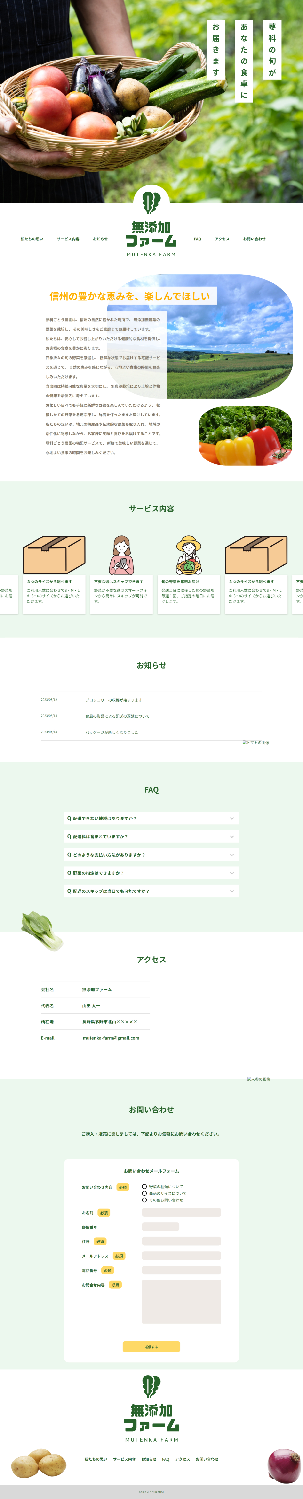 架空の無農薬野菜宅配サービスのサイトです。 【HTML、CSS、SCSS、jQuery、JavaScript】