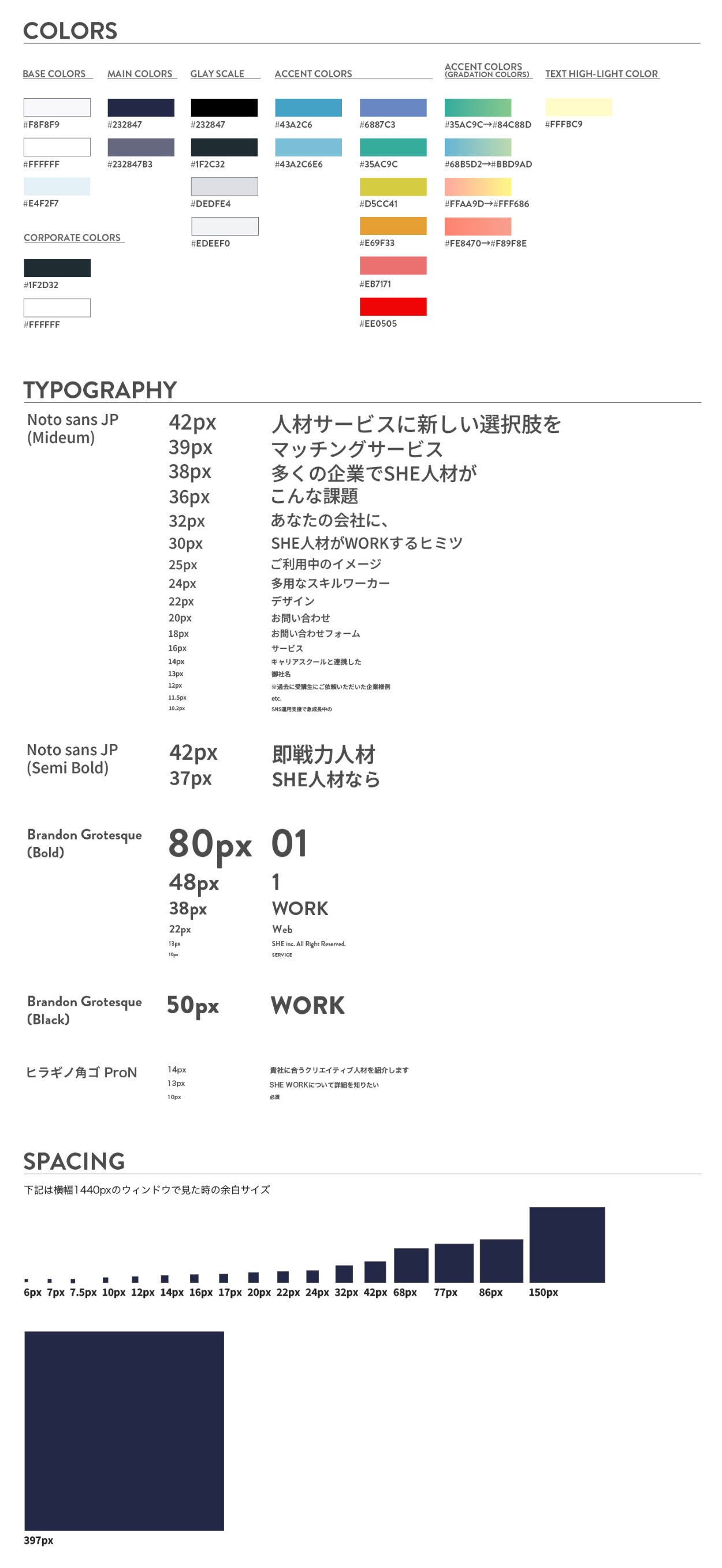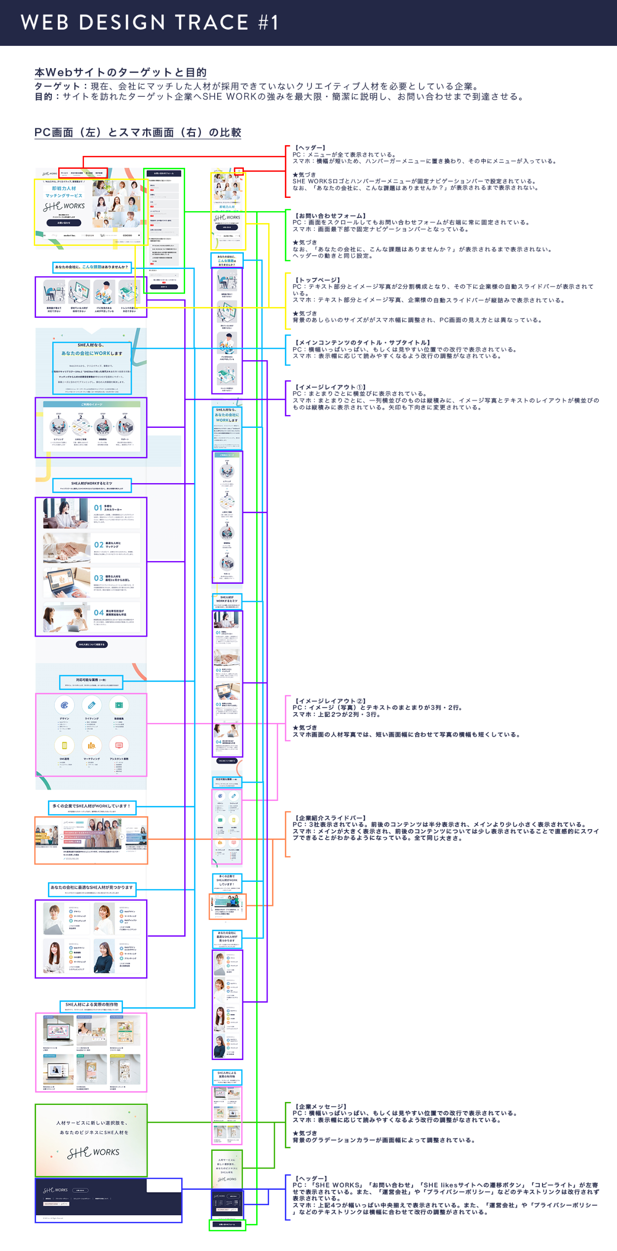 SHElikes PRO デザイナーの演習課題でWebページトレースを行い、スタイルガイドとPC/SPの違いのまとめを制作しました。