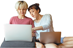 ターゲット①にも②にも刺さるバナーにするため、女性2人が1つのPC画面を見ている写真をメイン画像に選びました。1人の女性がPC画面を指差していますが、自分が通っているEnglish Girlsに友達を勧誘しているようにも、「English Girlsという英会話スクール気になっているんだよね」と友達に話しているようにも見えます。また、吹き出し内のセリフを「English Girlsで英会話始めてみない?」にすることで、「私が通っている英会話スクールに来てみない?」という意味と、「英会話スクールの中でもEnglish Girlsが良さそうなんだけど、一緒にやってみない?」という両方の意味を含ませています。写真やセリフによってターゲットを狭めないように気をつけました。