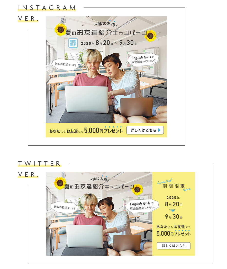 「英会話教室」「キャンペーン」「お友達紹介キャンペーン」「ポップ」「Instagram広告」「Twitter広告」「吹き出し」「ボタン」などで調べました。