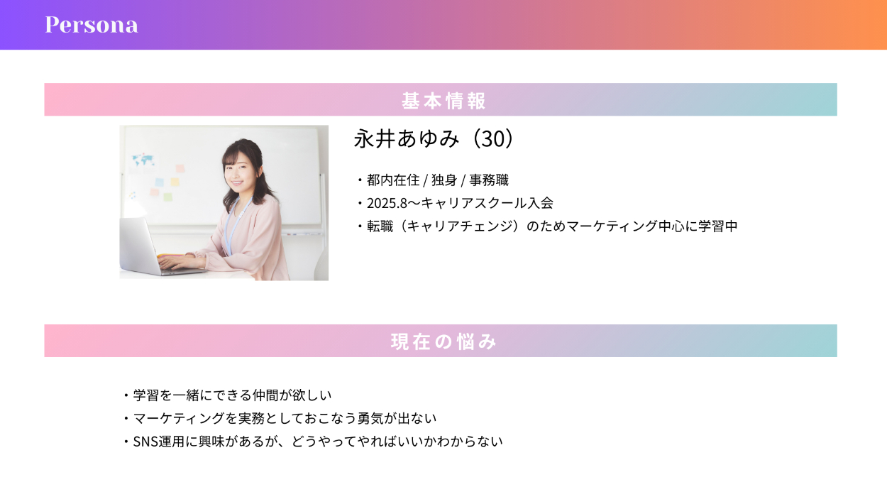 全体のトーンは、強すぎない・賢そうすぎない・子どもっぽくならないというバランスを意識し、マーケティング初心者でも心理的ハードルを感じにくいビジュアルに仕上げました。