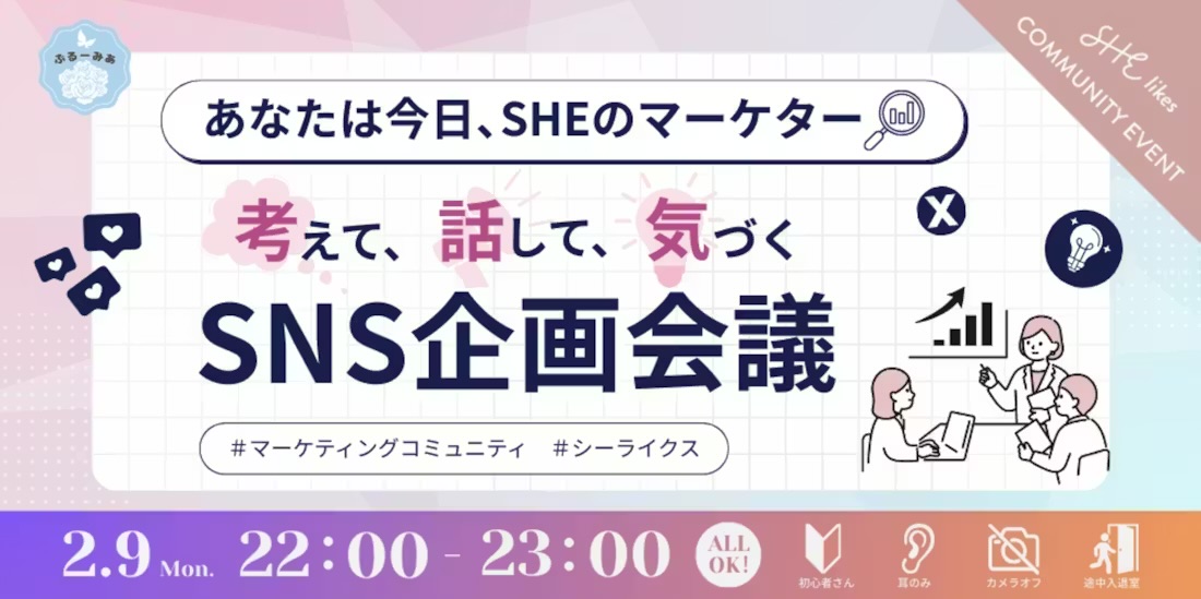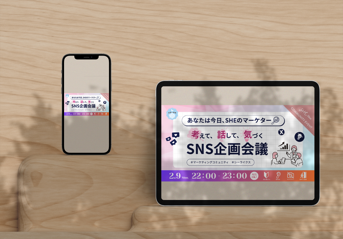 配色は、SHElikes(キャリアスクール)を想起させる淡いピンク・水色・グリーン・白を基調にし、春に向かう前向きさや、これから始まる学びへの希望を表現しています。