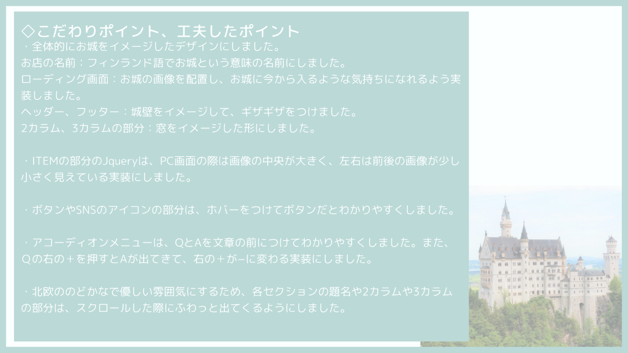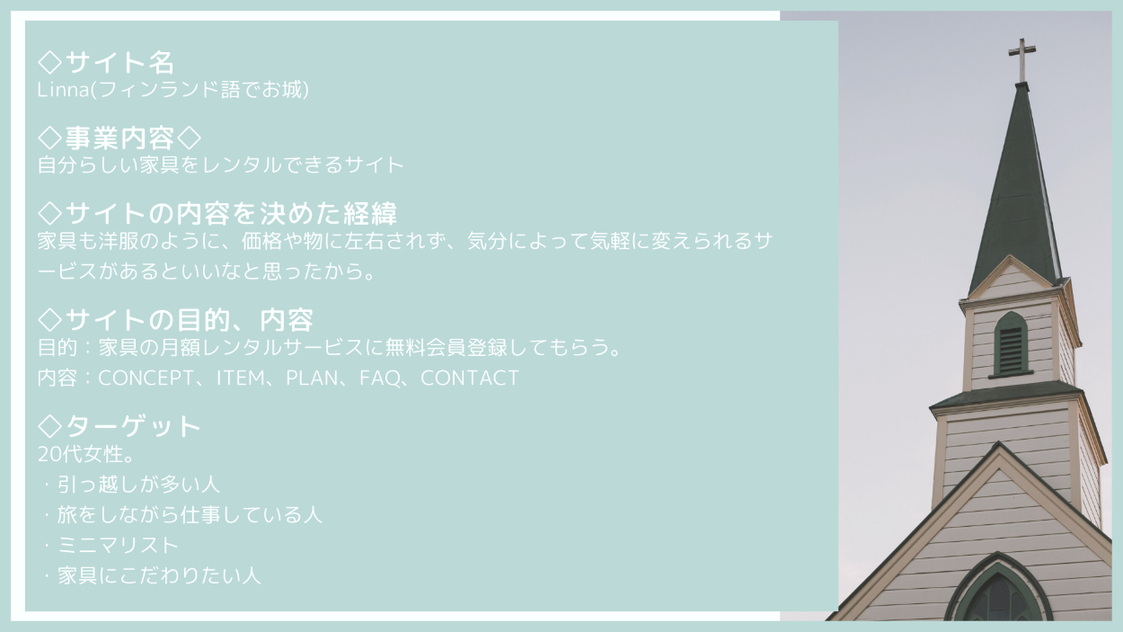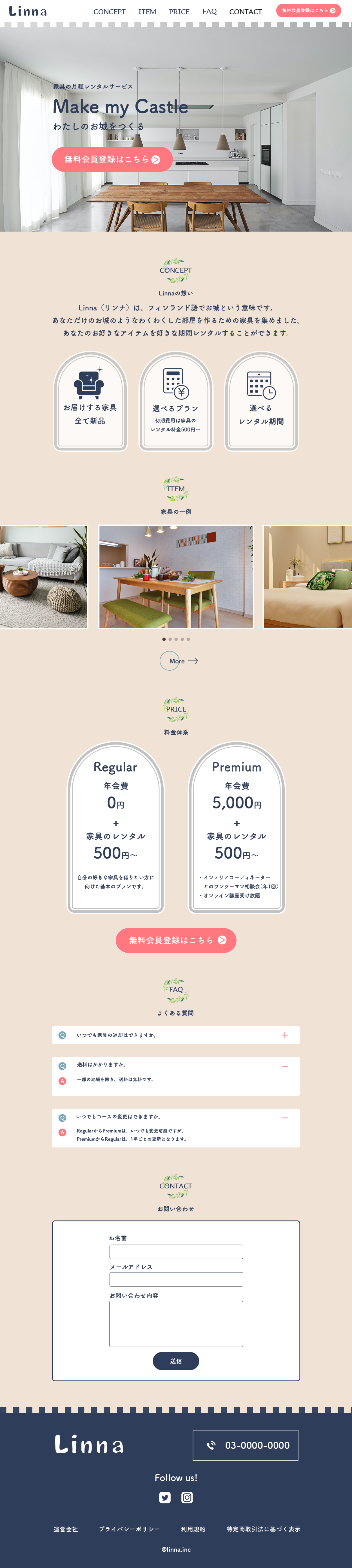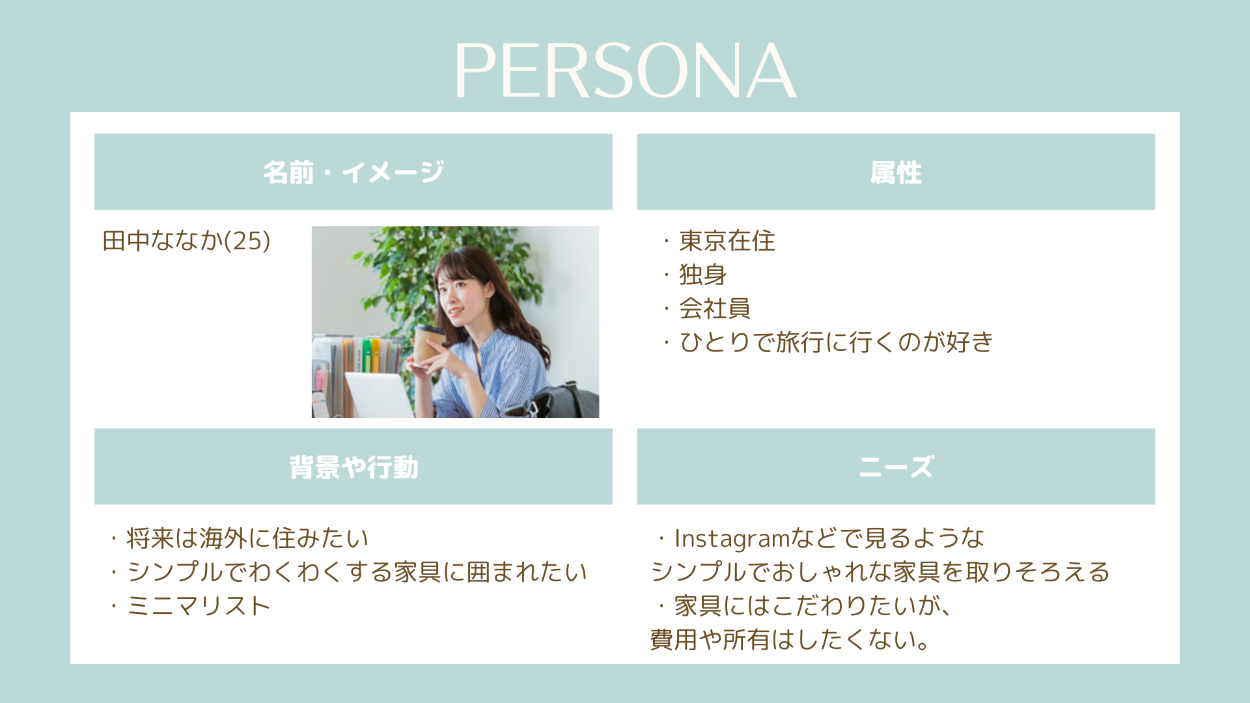 【自主制作】架空家具レンタルサイト(コーディング) Yuko Webデザイナー OVERVIEW 家具のレンタルサイトのLPを制作しました。 作業期間:2か月(約200時間) ◇制作したサイト◇制作したサイトはこちら◇要件定義◇◇ペルソナ◇◇PCデザインカンプ◇◇配色◇◇工夫した点◇