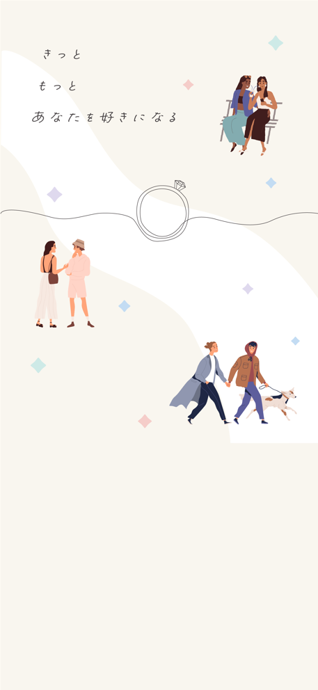 - ジェンダー意識という点では、だれが見ても親近感を持てるよう、様々な愛の形が一目で伝わるようなパートナーのイラストをAdobe Stockの無料素材から使用しました。日常風景を切り取るような自然なイラストを選ぶことにこだわり、「きっともっとあなたを好きになる」のイメージに繋げてシンプルな道のデザインと、落ち着いた配色バランスにしました。自作で、線画のような指輪のイラストを作成し、指輪を身近に感じられるような飾らない雰囲気で、多様性を意識したデザインに仕上げました。