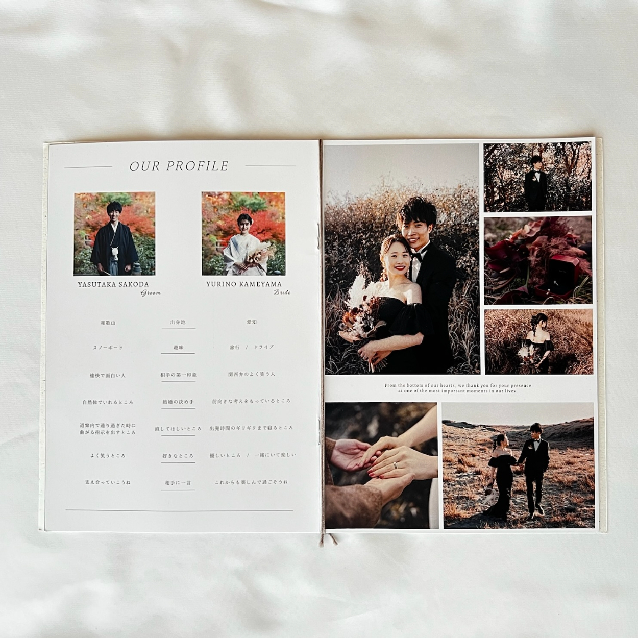 【実案件】結婚式プロフィールブック Mayuko Matsumoto Webデザイナー OVERVIEW 結婚式のプロフィールブックの依頼をいただき作成しました。 YEAR 2024 【作成期間】1週間【使用ツール】CANVA 制作したプロフィールブック