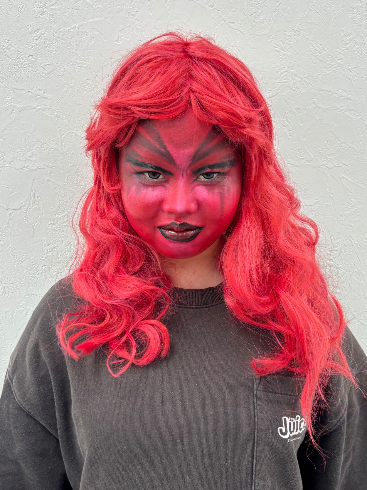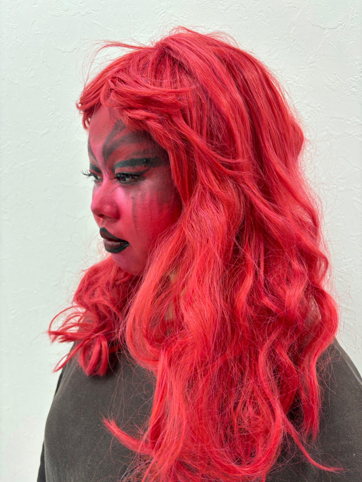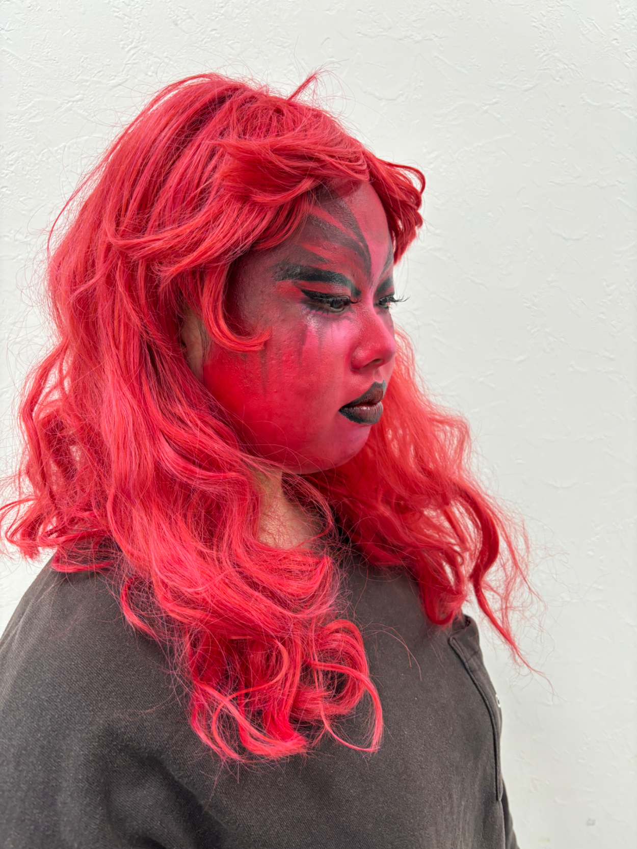 今回は怒りの感情をテーマにメイクしました。眉間や目元の陰影を強調し、全体的に赤みを加えることで高ぶる感情を視覚的に表現しました。