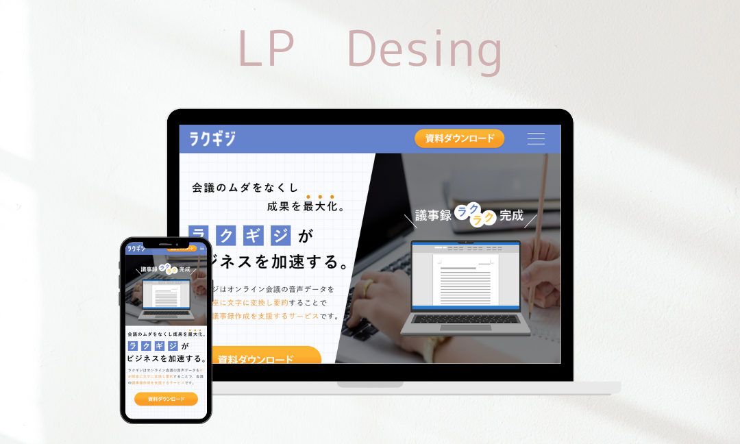 1番最初に目に入る左側にタイトルなどの文字、右半分に議事録を取っているイメージの写真を配置しました。パソコンの上に「議事録ラクラク完成」というワードを追加し、