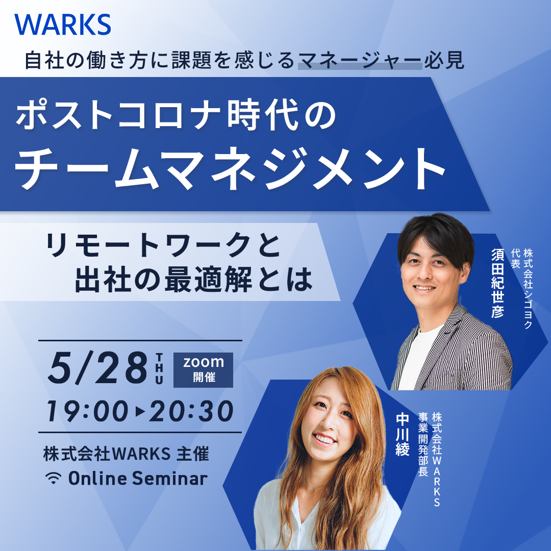 - 30代後半のマネージャーがターゲットということで、男性が多いと思ったので直線的でクールなデザインを意識し、背景にもポリゴンスタイルを用い、それをベースに登壇者の写真枠やタイトル背景の形も作っています。ただ、その中にも動きがあるように左右非対称にしています。