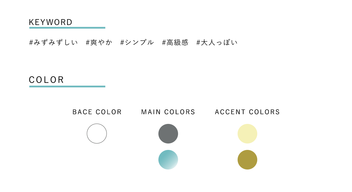 ・大人っぽさを表現するために、メインカラーにはターコイズブルーのグラデーションを使用しました。大人っぽさから連想されるベージュやグリーンではなくターコイズブルーを使用した理由は、ブルーには「安心感」「信頼感」を抱かせることができる効果があり、「安心してこの美容院に任せよう」と思ってもらいたいと考えたからです。また、明度を抑えることで若すぎる印象にならないよう工夫しました。