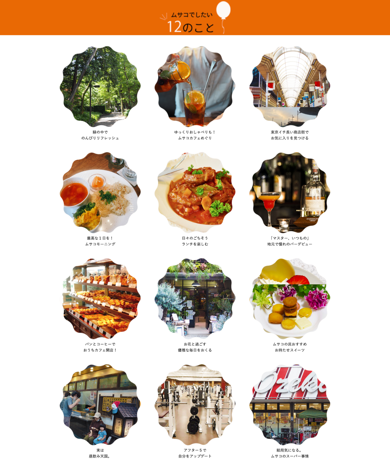 ターゲットが「思わず読みたくなるサイト」を意識し、ターゲットが興味を引くようなテーマを複数考え、「ムサコでしたい12のこと」という街紹介ページを設けた。ターゲット層に親しみのある12種類のテーマで街を紹介することで、街への興味を持ってもらえる構成を目指した。パソコン版の「12のこと」の画像部分は、ホバーすると写真が変わる仕掛けを施し、利便性を損なうことなく、より多くの写真をユーザーに見せるよう工夫した。