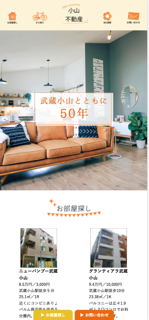 パソコンとタブレットではページ右に、スマホサイトではページ下部に「お部屋探し」、「問い合わせ」のボタンを設置することで、興味を喚起されたターゲットがすぐに物件を探せるようなUIを目指した。