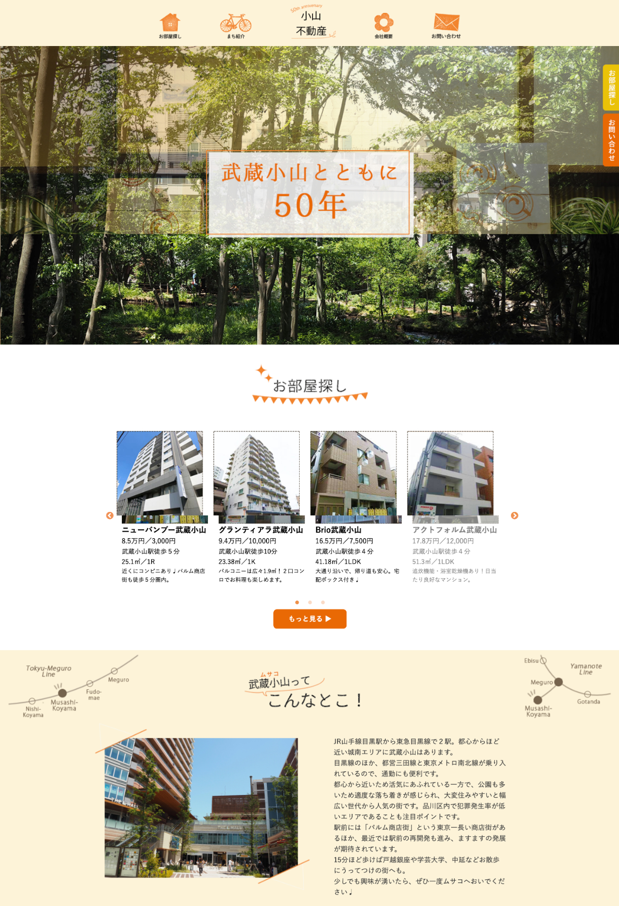キャリアスクール「SHElikes」WEBデザイン初級コース卒業制作として、Photoshop・Illustrator ・HTML/CSS・jQueryを使用したLPページを制作。品川区武蔵小山の架空の不動産会社のサイトを想定している。