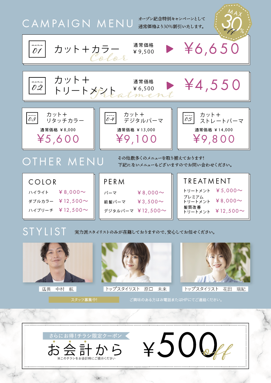500円オフの部分は当初「切り取って持参」という想定だったが、煩雑であるため「このチラシを持参」に変更、裏面下部に大きく配置した