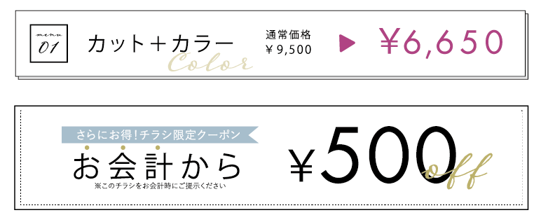 「500円オフ」が一番伝えたい情報のため、二分の一のスペースを使用しました。左側の文章は単調になりがちのため、クーポン文言をリボン内に収め、「お会計」から500円が引かれることを伝えるためにアクセントとつけています。